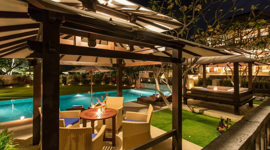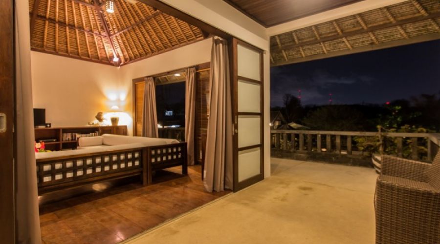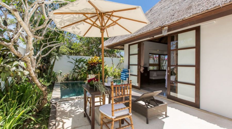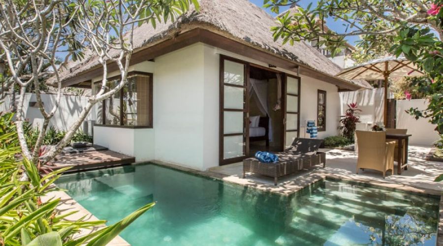 This three bedroom villa is very unique; it has 1 unit main swimming pool and 2 units of plunge pools on 2 separate bedrooms. The main pool located in front of Master Bedroom, with 2 units gazebos to enhance relaxation while staying. The villa has its own private garden that suitable for small gathering events with maximum 120 guests in standing or 80 by sitting condition. The villa offer exclusivity and full relaxation for its guests.
