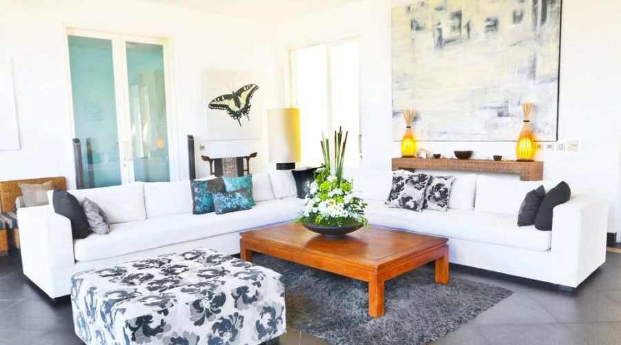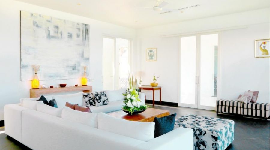 - Air-conditioned living room with comfortable big sofa and view of the ocean.