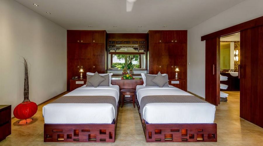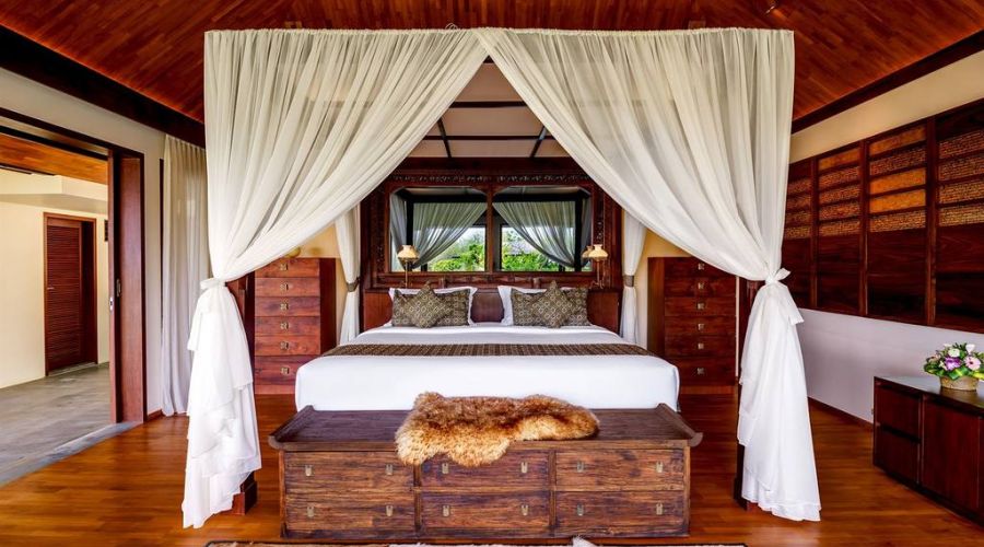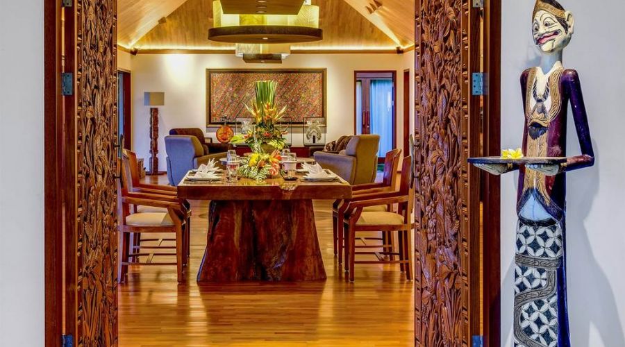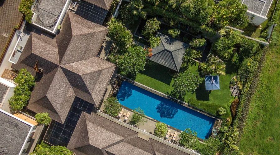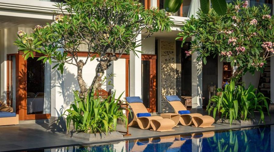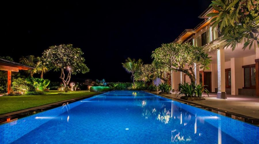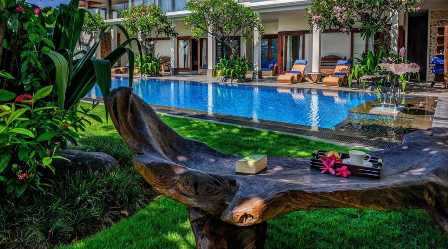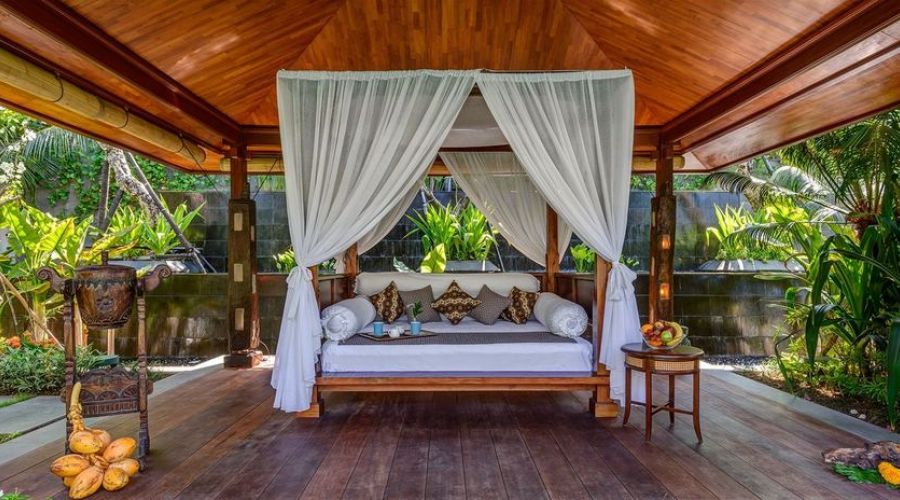 The name of villa was selected as its beautiful gardens host a unique selection of 12 different varieties of Bali’s most famous flowering trees, each with different colored flowers, blooming at different times of the year. The beautifully manicured gardens further feature large multi colored bougainvillea, a massive cascading multi-level water pond filled with a variety, catfish and a plethora of fish traditionally found in rice paddies and creeks.