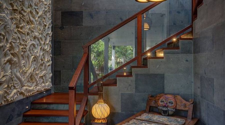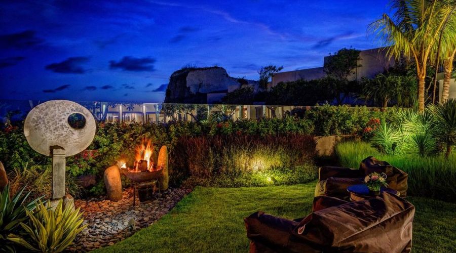 The clean lined architecture of the villa and thoughtful contemporary interior designs, using the best indigenous materials from Indonesia, are complemented by an unique international art collection including Balinese, Javanese and Chinese collectables. Custom designed and crafted lighting fixtures are found throughout the house, creating a magical experience at night. A very special experience is a night time bonfire under copper crafted penjor lights with magical star-scape and the sounds of the surf breaking below the cliffs.