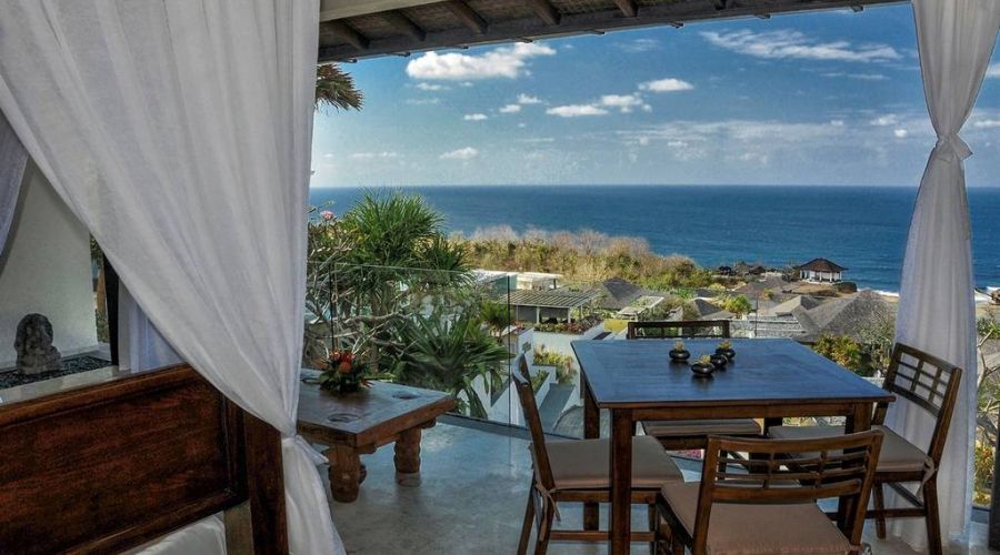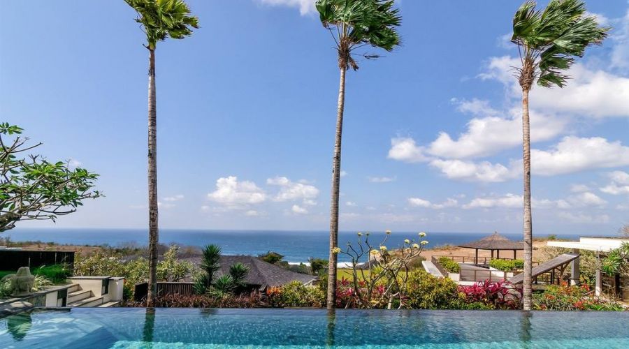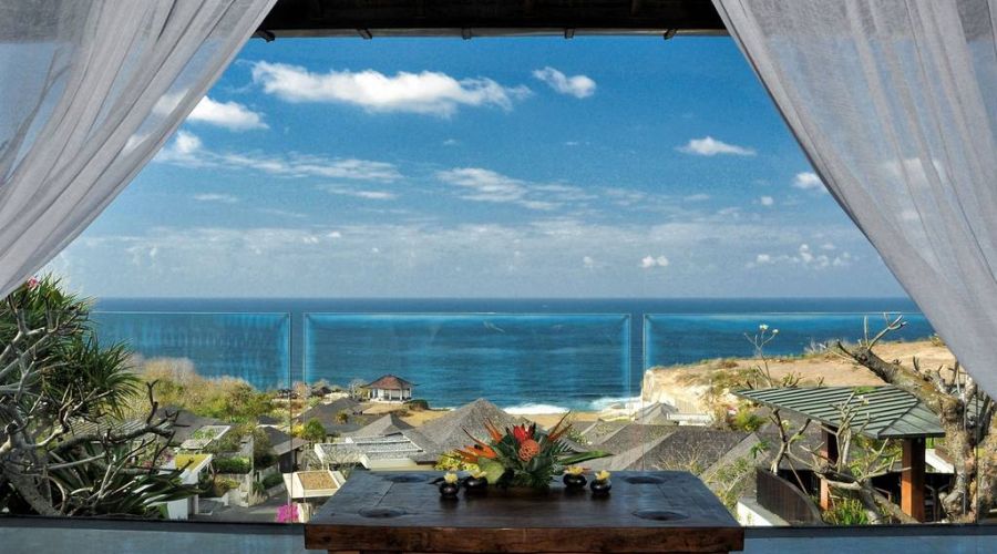 The 22-meter infinity edge ocean view pool and Bale set in its gardens create unique vantage points over the Indian Ocean and a cliff edge Balinese temple.