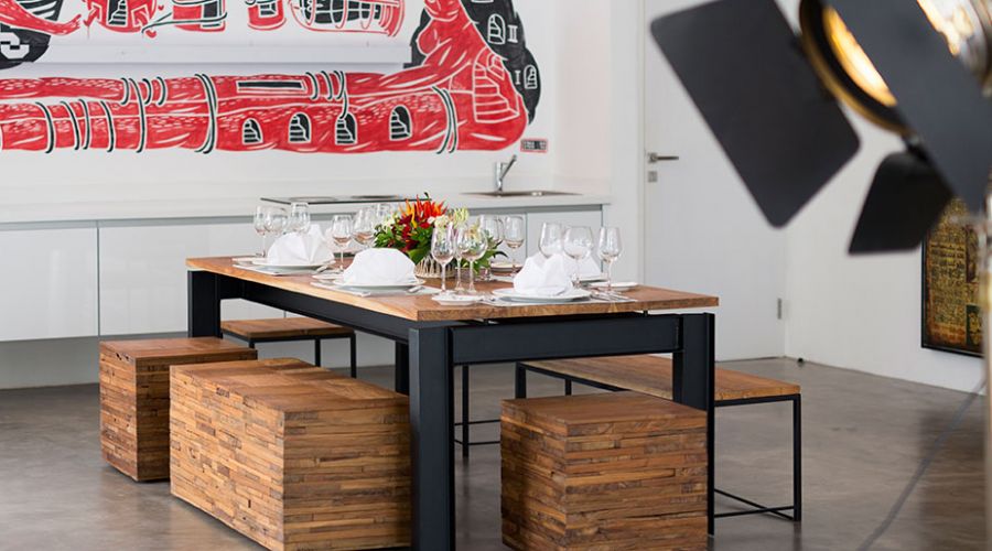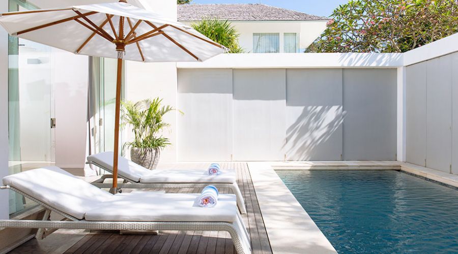 Comprising a delightfully spacious L-shaped living and dining room with an integrated kitchenette for guest use (in addition to the main service kitchen, which is the domain of the chef), the villa is decorated with an exciting collection of colourful paintings, murals and sculptures, including an fascinating futuristic sculpture of a ship suspended from the ceiling. From the living area, floor-to ceiling glass doors slide open to a private swimming pool and sundeck. The two interconnected bedrooms are located upstairs. Each is furnished with a king-size bed that converts to twins, and equipped with audio-visual facilities. Each is adjoined by its own private stylish bathroom with a walk-in rain shower.