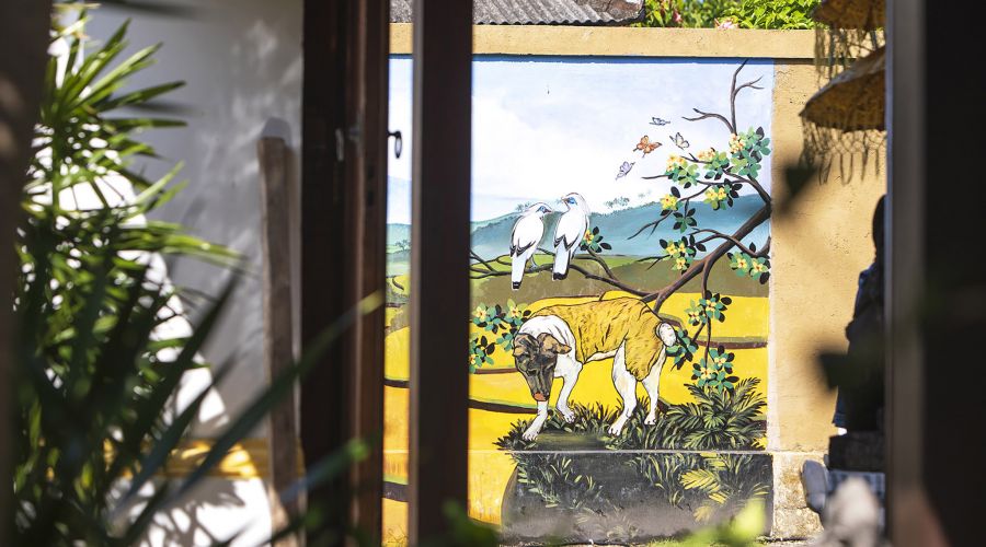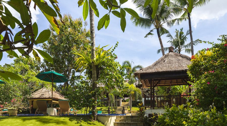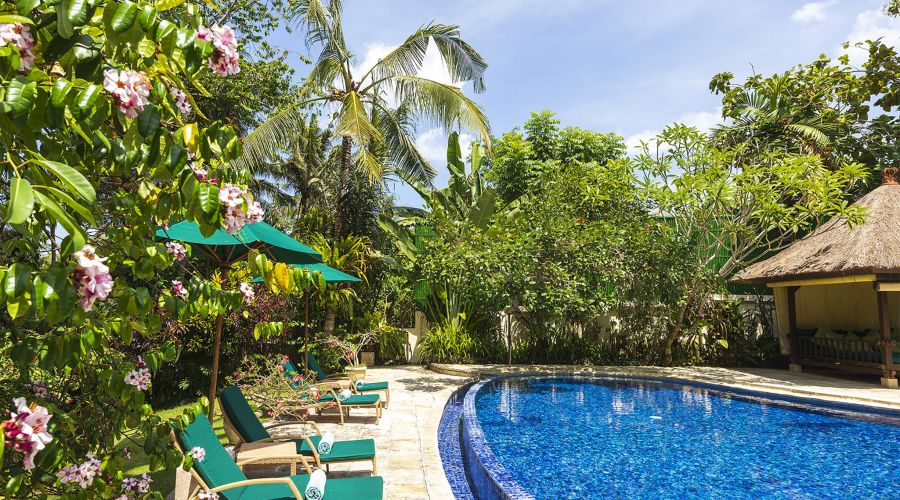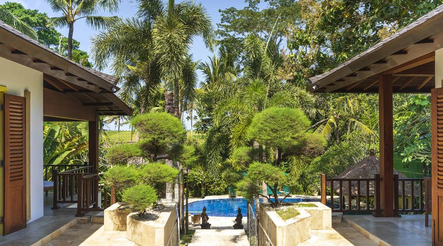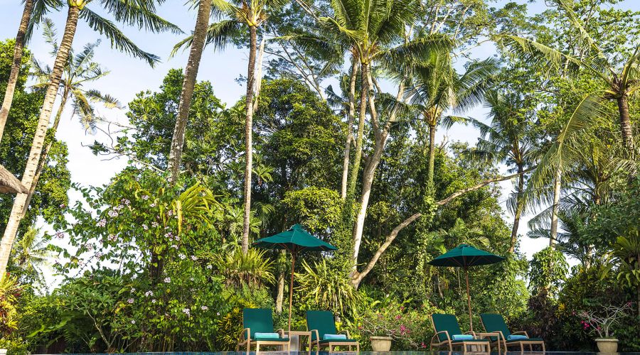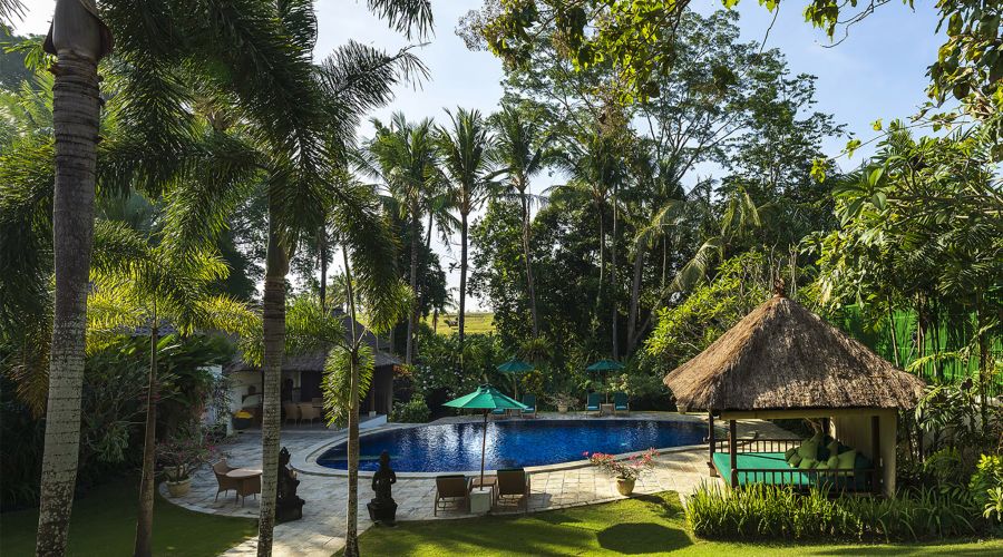 The villa comprises an open-sided fully equipped kitchen and an air-conditioned media room facing each other across the pond while, on the far side, the main building incorporates a living and dining hall and three bedrooms. Beyond the main house, a beautifully landscaped tropical garden, complete with its own serene temple, rolls down manicured lawns to a generously sized swimming pool and a thatch-roofed dining pavilion. The garden vista flows on to the tropical jungle canopy outside the villa walls and beyond to the surrounding rice terraces creating a picture-perfect backdrop to the serenity of the villa.