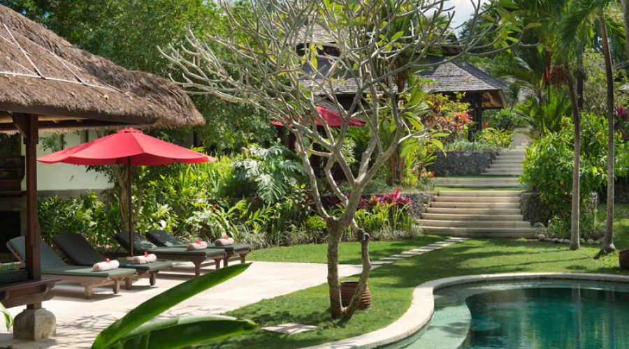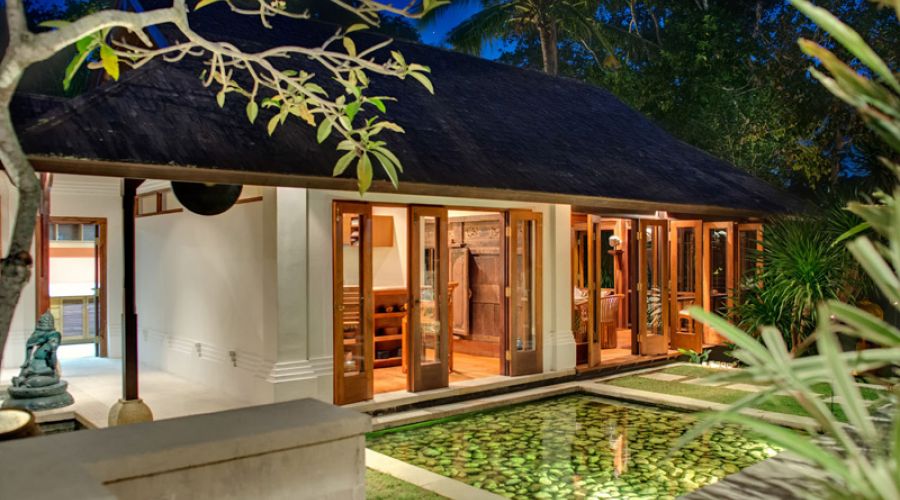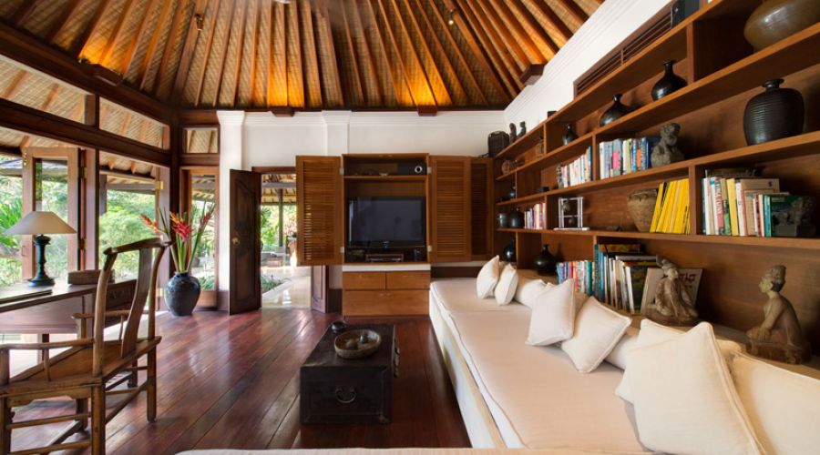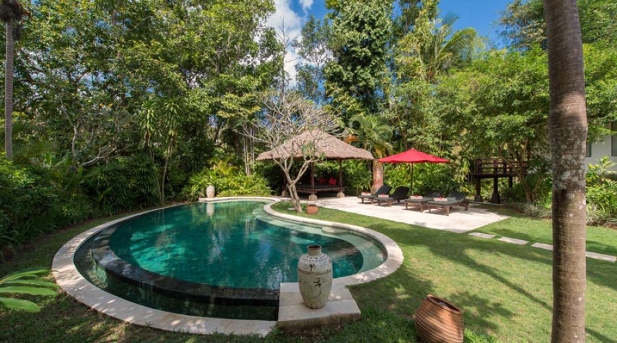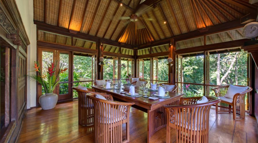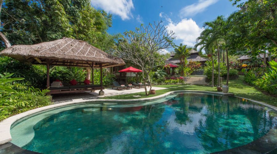 The villa flows with spaces for guests to unwind and relax too, from the generous open-sided living pavilion cooled by ceiling fans, to the air-conditioned study with its large satellite TV and DVD player, or the traditional balé (relaxation gazebo) that overlooks the stunning free-form swimming pool by the river’s edge.