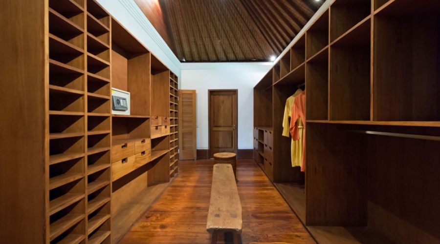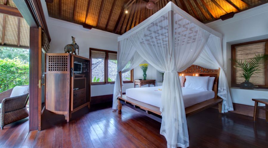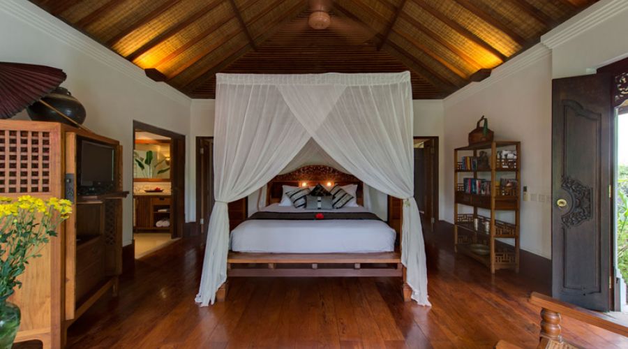 The air-conditioned master bedroom lies at the lower end of the garden, close to the river and the pool, and is the ultimate honeymoon hideaway. The bedroom features a delicately carved queen-size four poster bed, polished teak floors, vaulted ceilings and large glass doors that open onto a stone terrace furnished with table and chairs – just the spot for a lazy breakfast. Furnishings include a comfortable planter’s chair and a wood cabinet housing a TV, DVD player and music system. Behind the sleeping area is a very large dressing room with generous storage space.