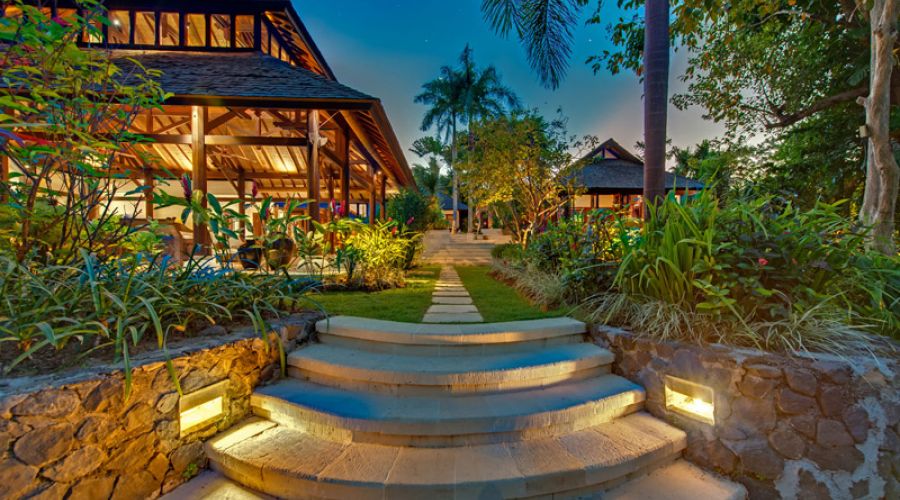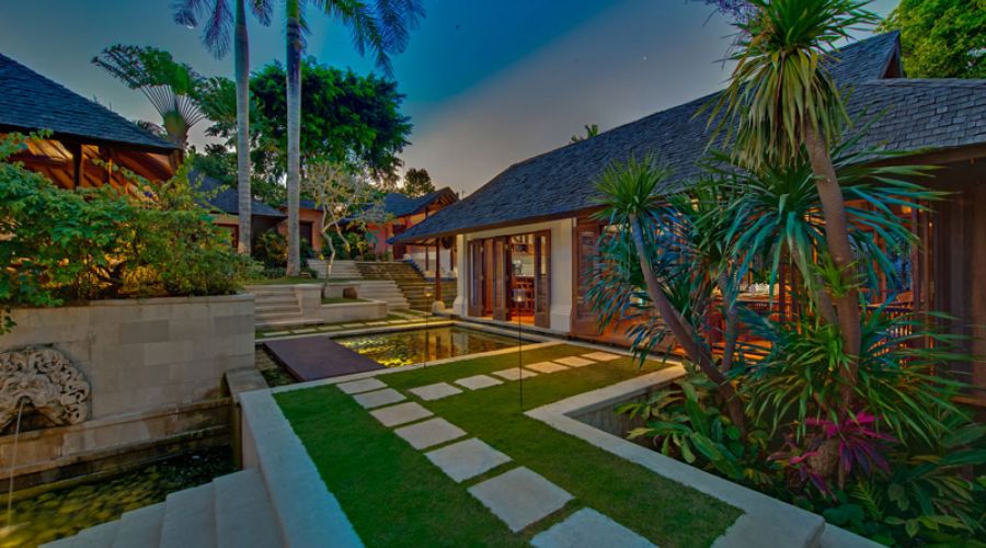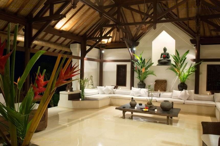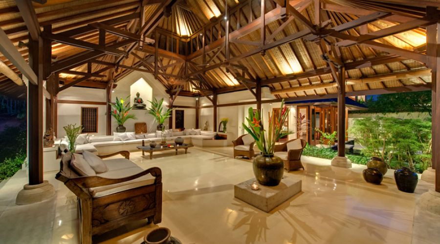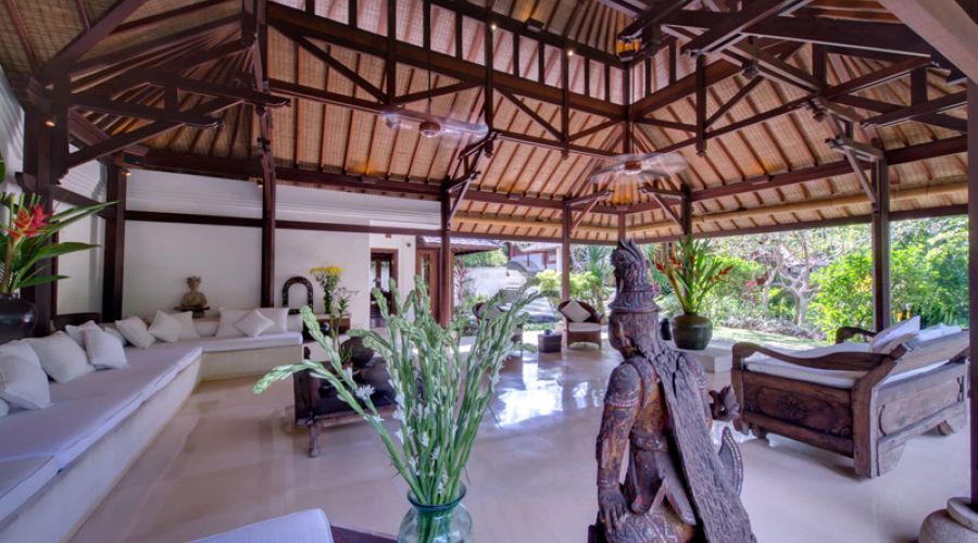 Presiding over the gardens at the centre of the villa compound the open-sided living pavilion with its lofty two-tier roof, coconut wood pillars and cool cream terrazzo floors, makes an ideal base for entertaining and relaxing. A large Buddha statue flanked by vases of tropical flowers casts its eye over the white-cushioned lounge where guests can lie back, cooled by ceiling fans, and take in the natural setting or admire the owner’s collection of antiques.