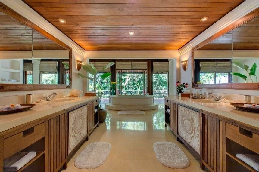Carved teak doors slide open to reveal a huge air-conditioned bathroom tastefully finished with polished cream terrazzo floors, his-and-hers vanities, a tiled double bathtub, massage table and walk-in shower. A special feature of this majestic bathroom is the secluded timber balcony, accessed via glass doors.