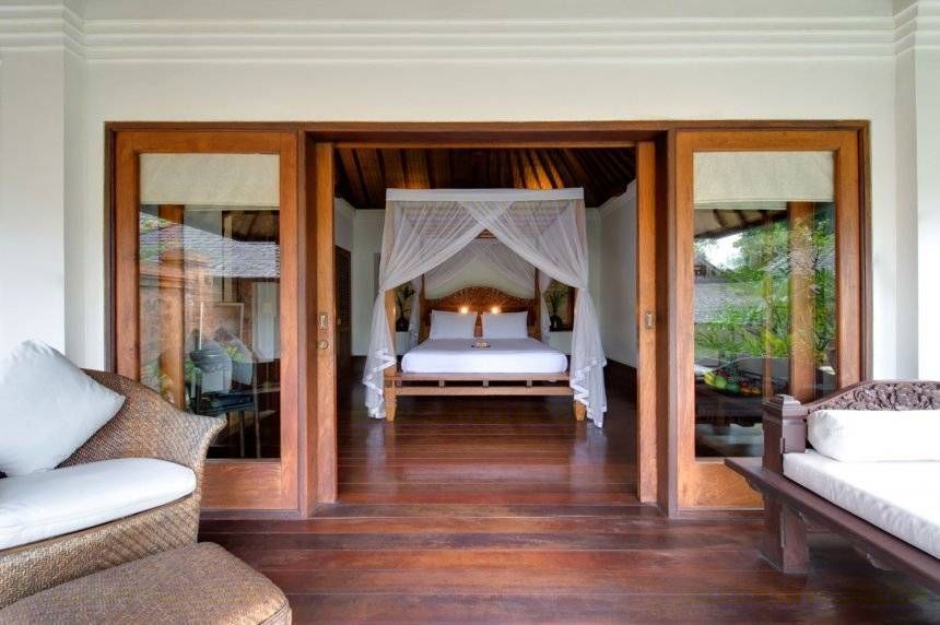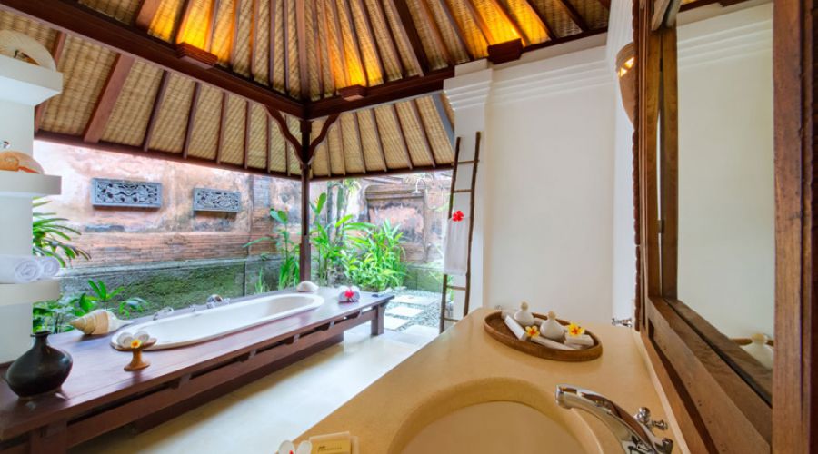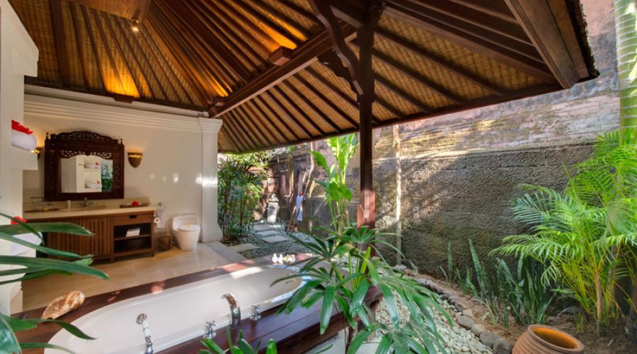 At the top of the villa compound, nearest the entrance, two guest bedrooms feature polished wood floors, vaulted ceilings and queen-size four-poster beds. Both rooms have large Balinese-style garden bathrooms enclosed by lichen-covered walls. Here guests can bathe au naturel under the rain shower or soak in the bathtub set within a teak surround.