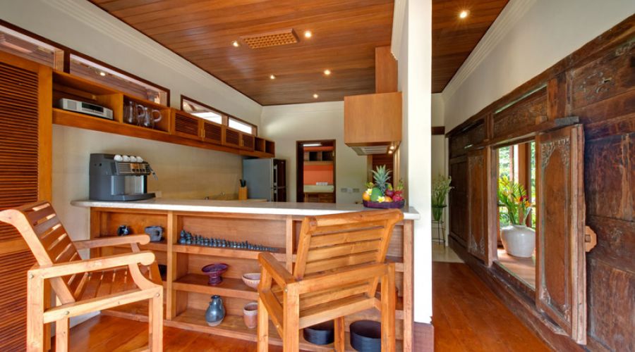 Stepping stones cross the fish pond to a handsome dining pavilion where a gleaming teak table seats up to eight guests. Although the dining pavilion offers the option of air-conditioning, three walls of floor-to-ceiling windows can be flung open to appreciate the songs of the river and the birdlife, the fragrances of the garden and views over the villa’s temple towards the pool. A notable feature here is the antique wooden panelling that separates the dining room from the adjacent kitchen with its marble breakfast bar and bar stools.
