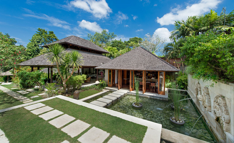 To one side of the living pavilion is a cosy air-conditioned study that can be converted as another bedroom when required (charges apply). It features a large flat-screen satellite TV and DVD player. A wall of bookshelves holds a good selection of books, games and puzzles as well as an extensive CD and DVD collection. In front of the study a fish pond is fed by water from decorative stone spouts carved in the image of the barong – a lion-like mythical Balinese character.