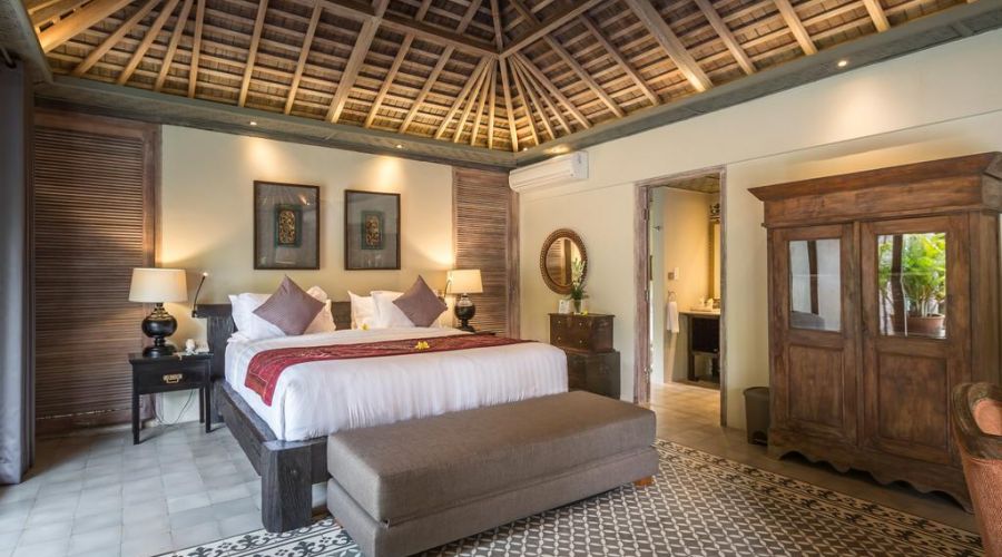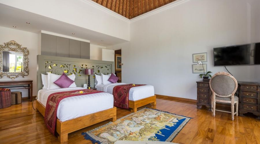 The main building has 3 A/C bedrooms, one on the first floor, the two others on the second floor. All of them are spacious, bright and offer all modern facilities such as TV with international channels. Both has king size beds, expect one of them which has twin beds. The two rooms above offer a stunning balcony, where you can enjoy a nice view on the rice field, from on side, and the pool on the other side. From this place, you can get a massage upon request. Each room features bathrooms with showers and wooden bathtub.