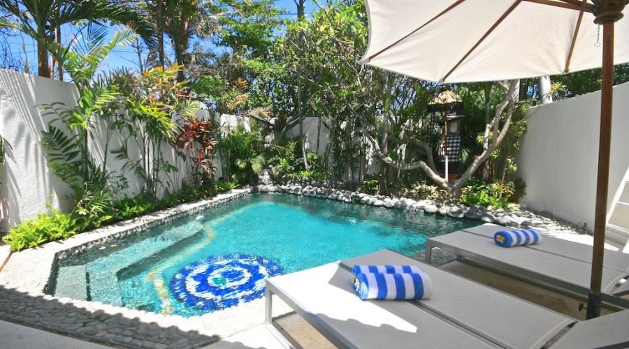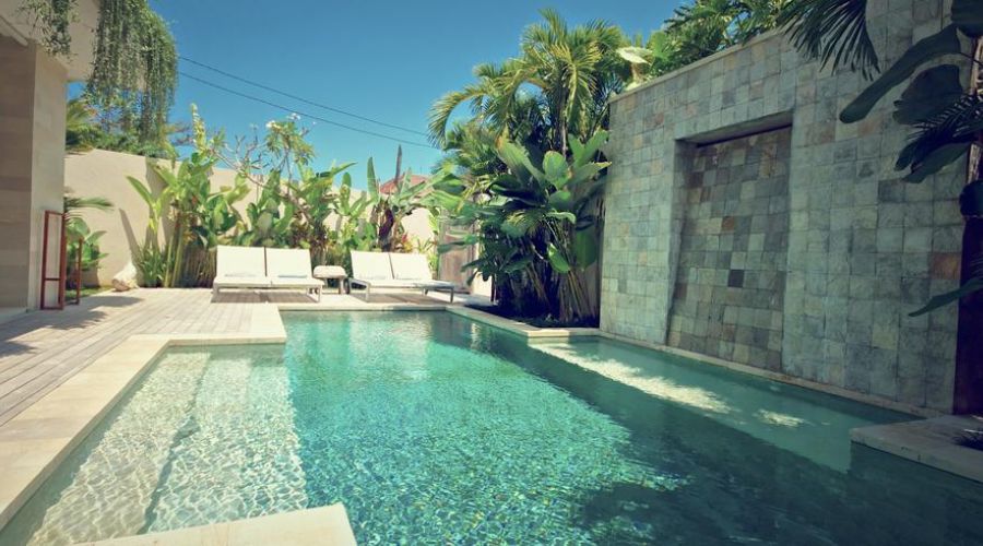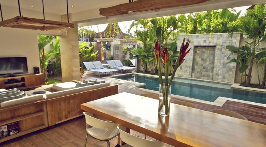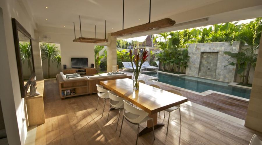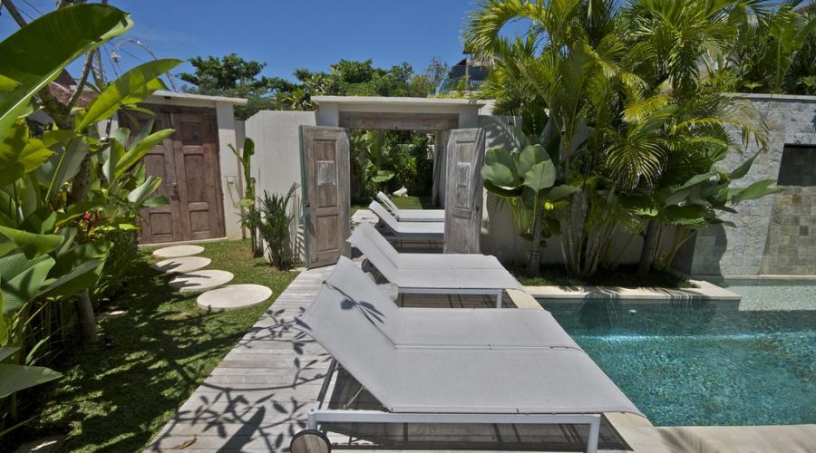 The custom designed 9 x 4 meter water pool steps down from the living room, providing the perfect place to spend lazy days lounging in the sun. A natural stone water feature flows down to a shallow sitting area flanked by gardens on both sides. The pool deck is made from reclaimed teak wood and when the villas are rented as a 4 bedroom unit, an antique door can be opened to create a large common deck area.
