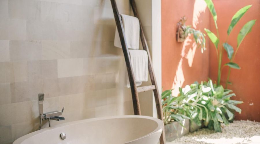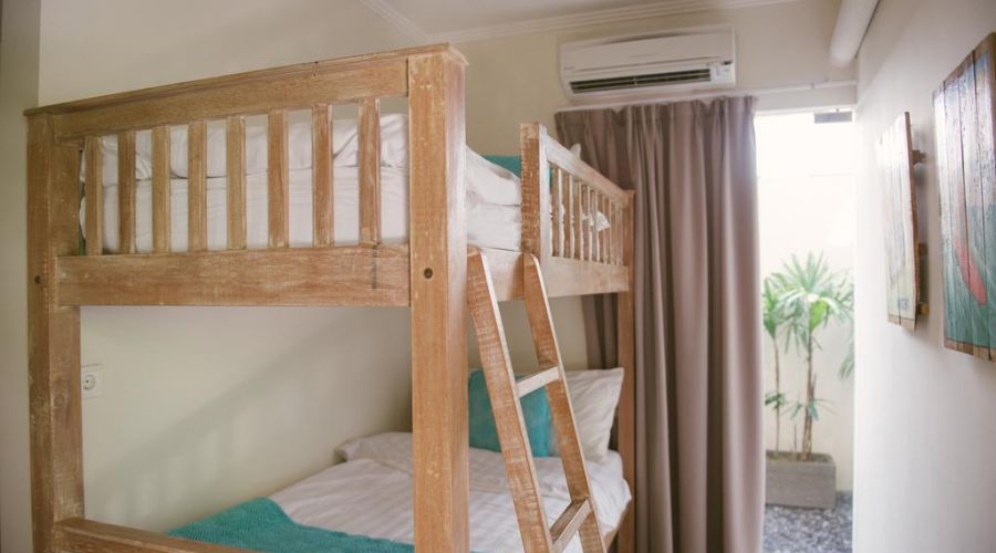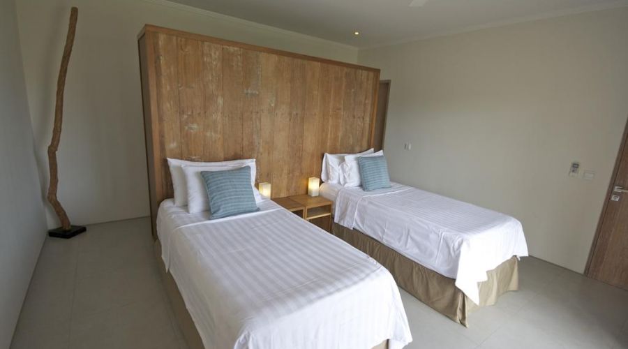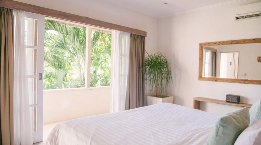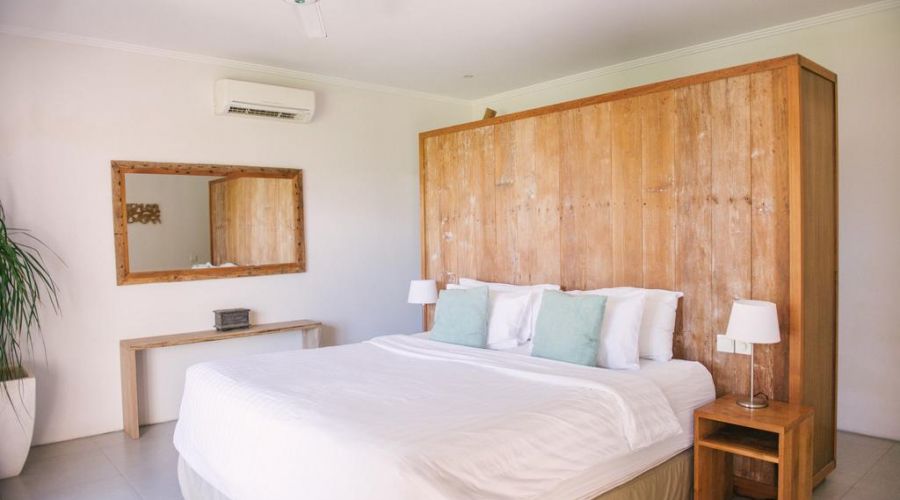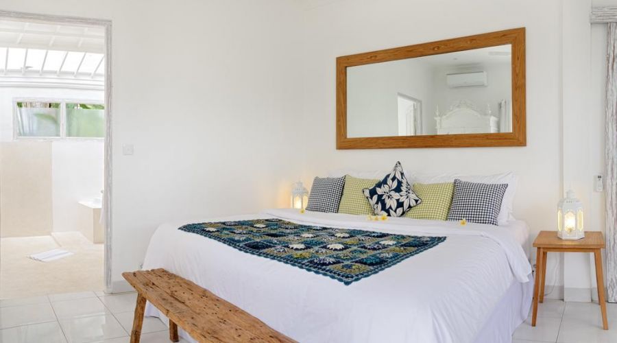 All bedrooms are very spacious and are equipped with air-conditioners and ceiling fans. Reclaimed teak planks have been used to create backboards for the beds, which also form the large wardrobe. Downstairs bedrooms have sliding glass doors that open to the pool, while upstairs bedrooms open to the terrace and rooftop garden, and enjoy views of the ocean.