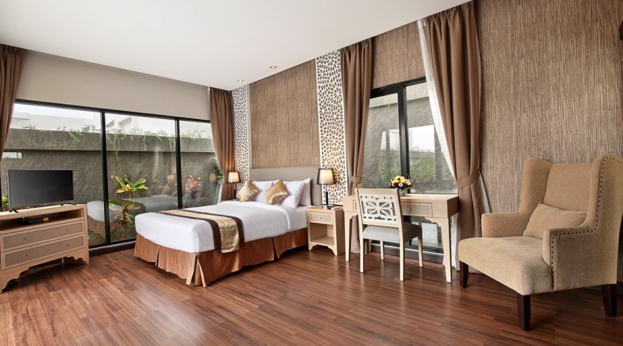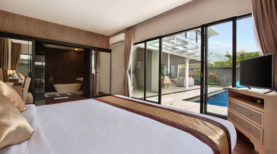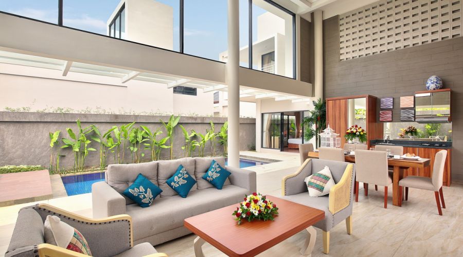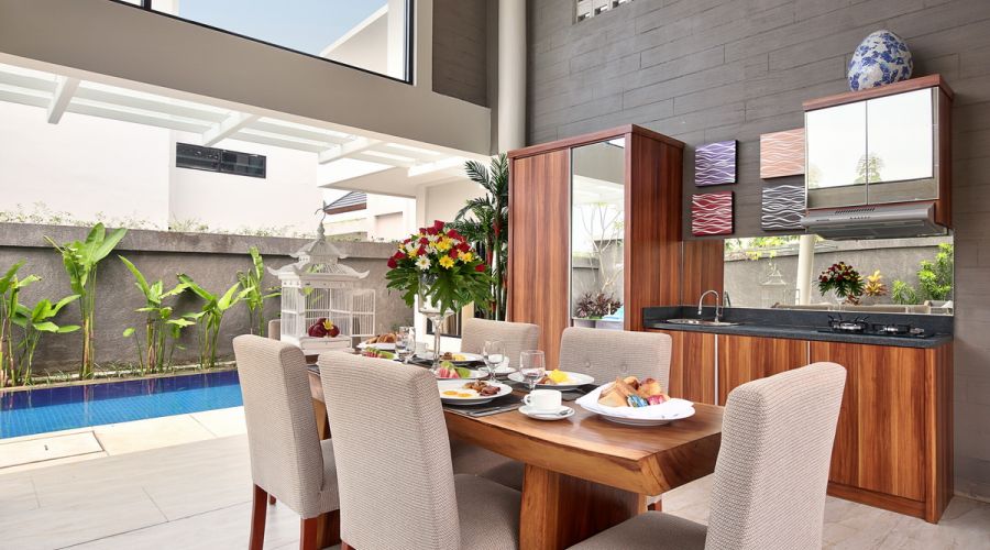 It is a haven that reflects efficient features and design, and you will love waking up to natural daylight through full-length glass sliding doors and radiating the rooms’ warm natural furnishing enhanced by modern comforts with king-size bed, luxurious linen and generous-sized en-suite bathroom. The Villa comes with a modern fully equipped kitchen and cozy open concept dining and living area, adjacent to the villa’s private pool.