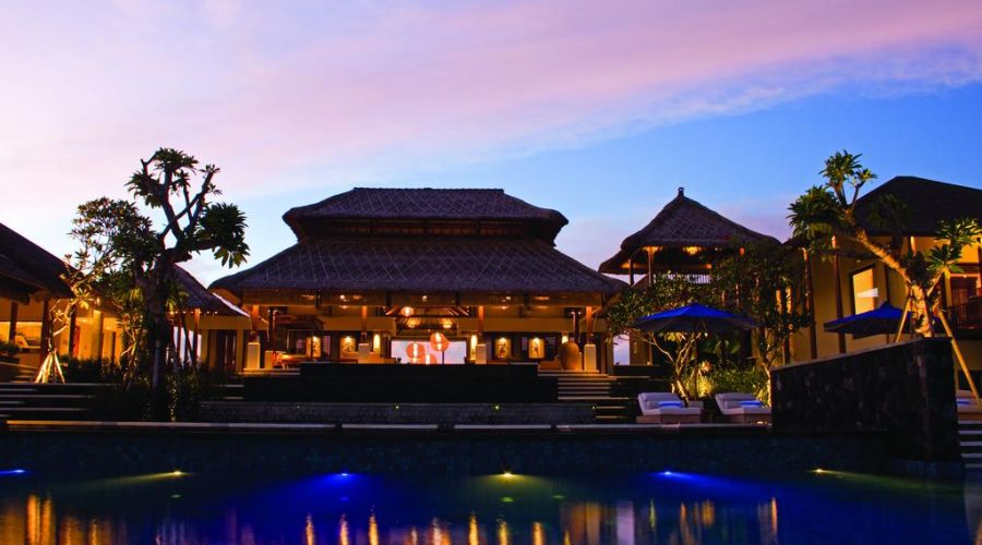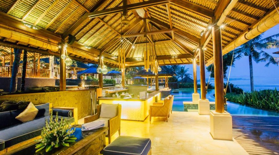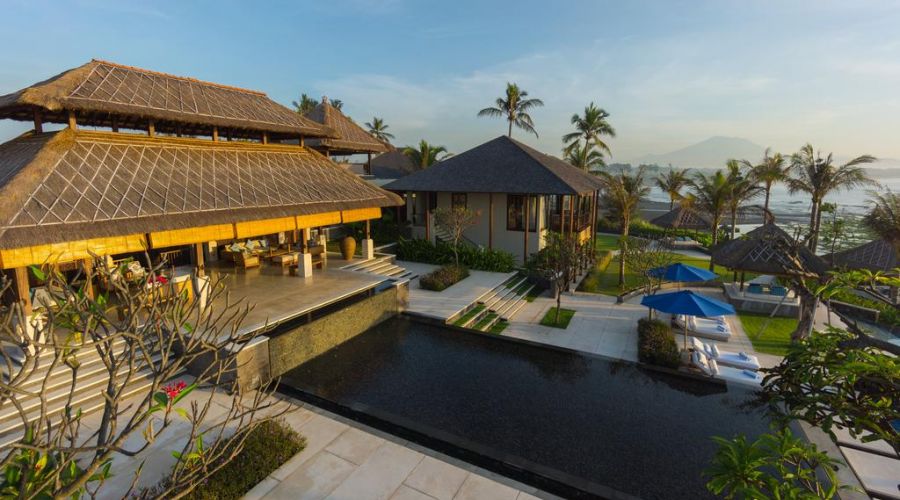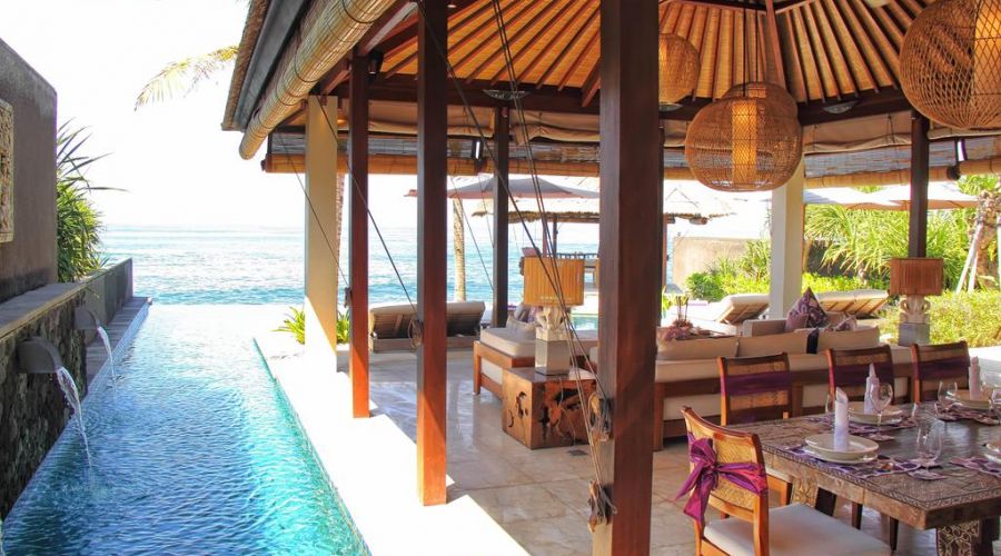The villa combines Western contemporary design with Balinese architecture with its thatched roofs, high ceilings and teak and white interiors.