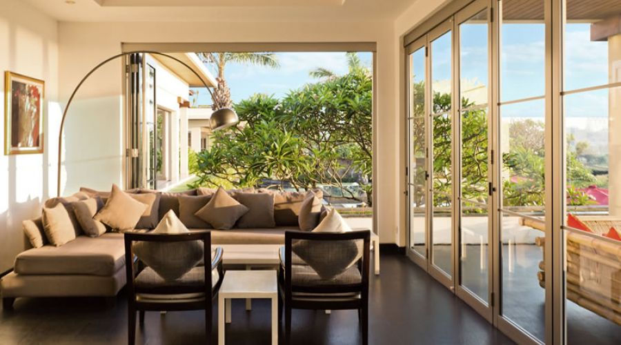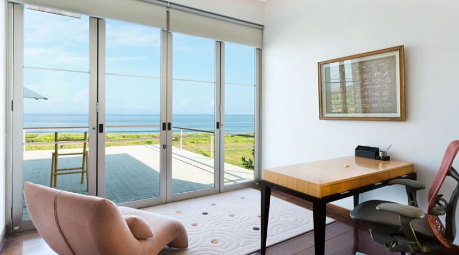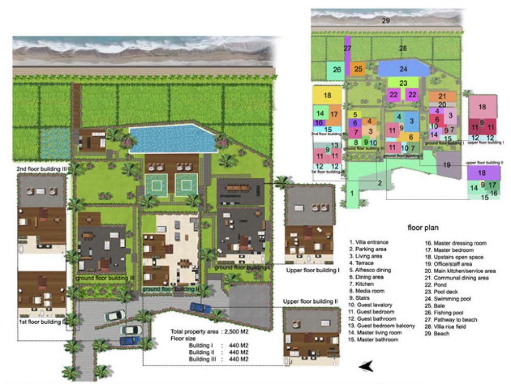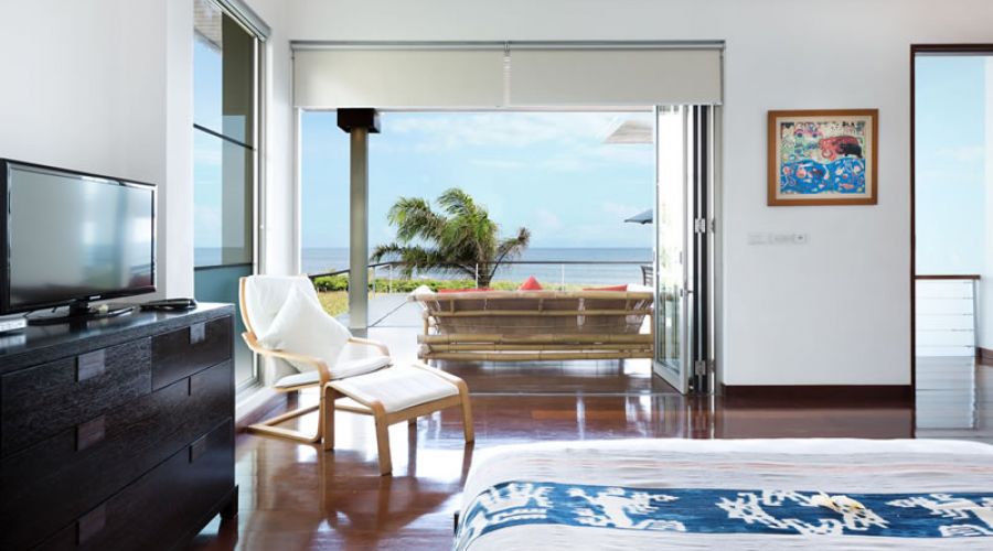 This beachside compound boasts of thriving gardens, calming water features, a huge fish pond, a sand volleyball court, a timber yoga deck, a 23-meter infinity pool with sundeck, a massage bale and a large conference room. Each of the three of the villas in this modern Balinese estate has its own spacious and comfortable living & dining rooms, a fully equipped kitchen, a breakfast bar, a breezy terrace, air-conditioned bedrooms and luxurious bathrooms.
