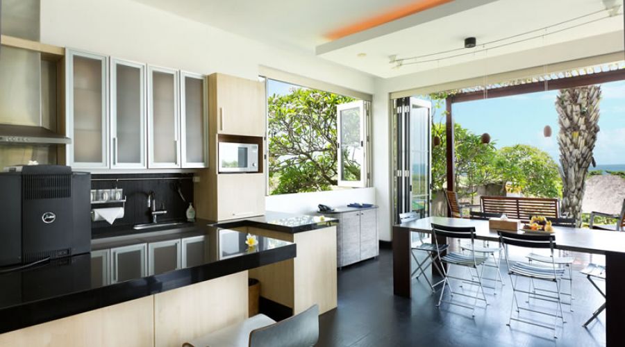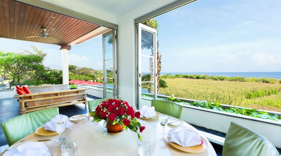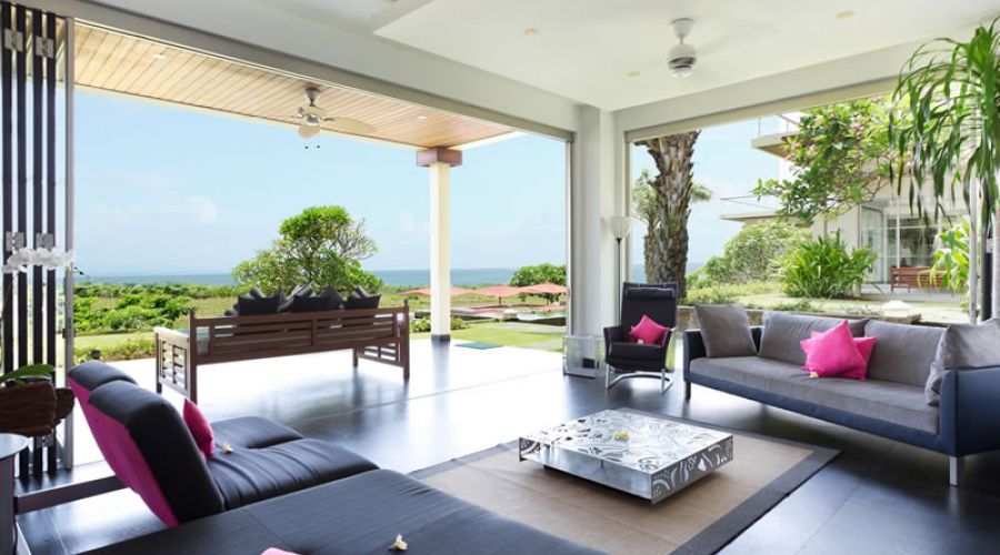 Just a short distance away from Padang Galak Beach on Bali’s southeast coast lies a picturesque nine-bedroom villa complex that offers panoramic ocean and countryside views. This rural beachside compound boasts of a sand volleyball court, a timber yoga deck, a 23-meter curved infinity pool, a massage bale, a large conference room and three self-sufficient villas.