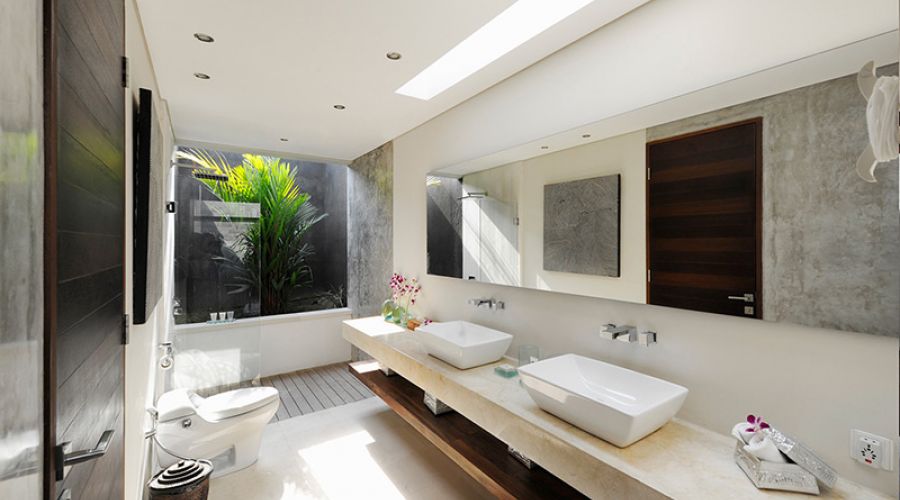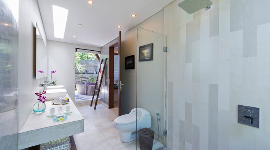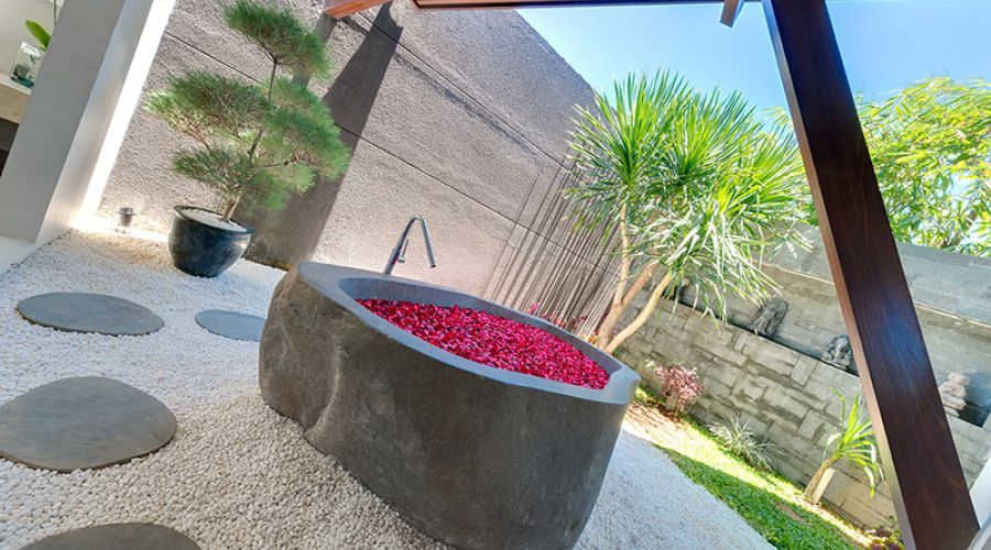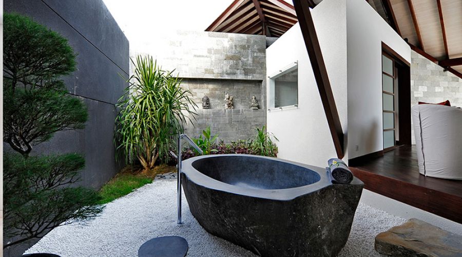 Honeymooners and couples will love the design of this large, light-filled king-sized bedroom with its stylish seating area, window onto the courtyard and sliding doors to the pool deck. There’s no scrimping on space in the garden bathroom either – an elegant expanse of Palimanan stone with foliage-fringed shower, elongated counter with twin basis, and – in the adjacent white-pebbled courtyard – a decadently statuesque stone bathtub.