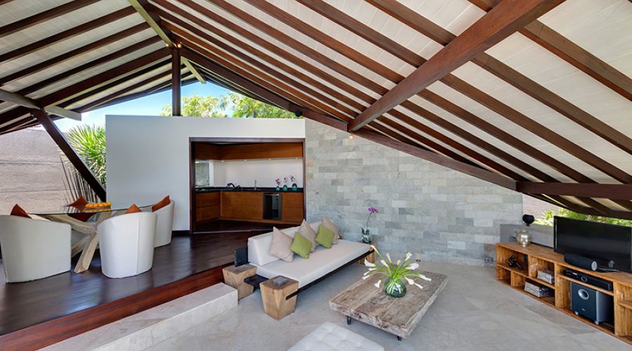Careful thought has been given to the villa’s romantic living area, resulting in a wonderful sense of space, openness and flow that couples will appreciate. With such a splendid selection of settings to chose from, relaxation comes easy, day or night. Drift between the custom-designed teakwood sofa facing the entertainment centre, the sun-loungers reclining on the pool deck, the tiered shallow section of the pool just beyond the living area, or even the stone bathtub gracing the courtyard garden.