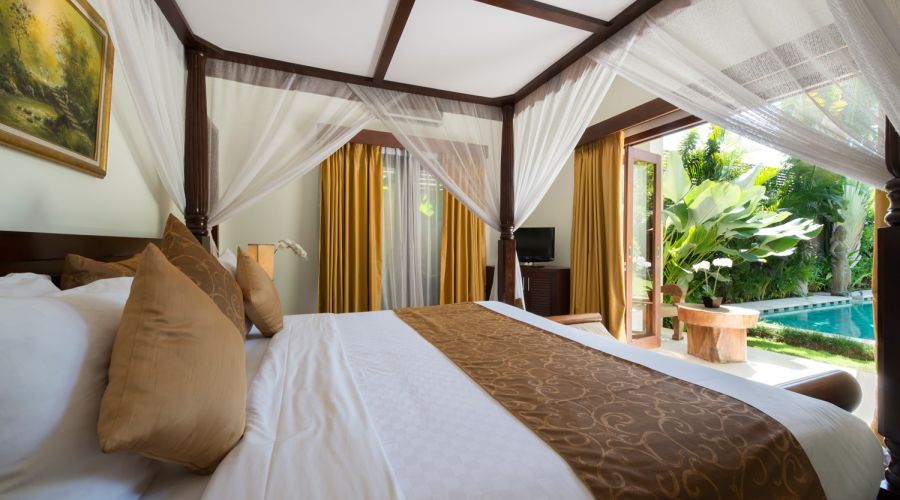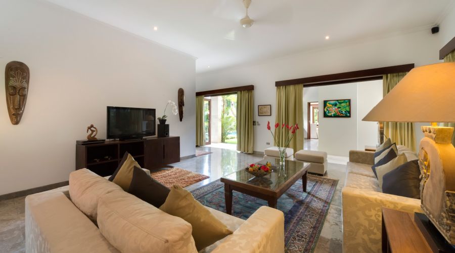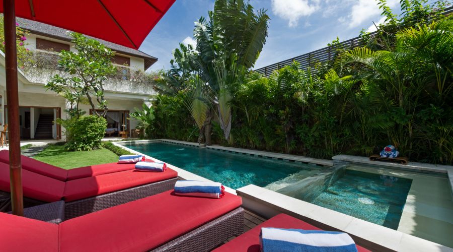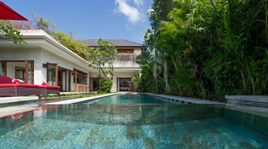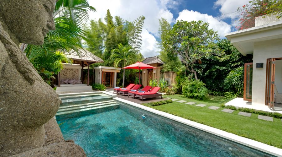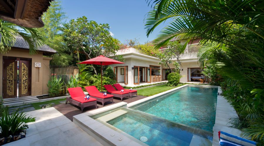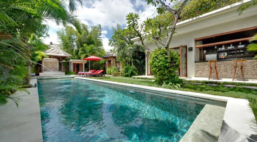 The private walled garden with its glistening swimming pool surrounded by tropical palm trees and aromatic frangipanis forms the centerpiece of this villa. The villa’s outside decking has lounge chairs and umbrellas under which you can luxuriate, catching the sun or reading a book, while also being able to watch the kids paddle in the pool.