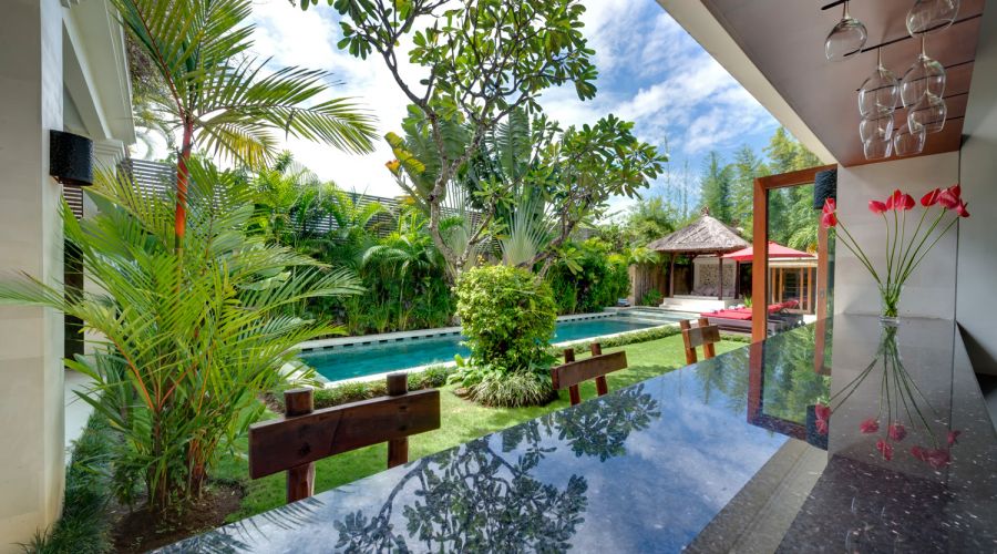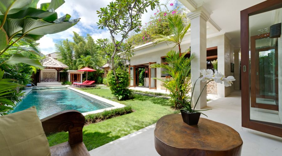 Entering via traditional wooden doors, guests are transported into a blossoming tropical garden with its breathtaking aqua blue sparkling swimming pool, around which the villa is arranged. The ground floor contains the open-plan kitchen and dining room, lounge room and one of the spacious master bedrooms with glass doors that open onto the garden and pool area. The second bedroom upstairs opens onto a terrace as well as an upstairs lounge and entertainment room. The villa also features a private balé and an outdoor infrared sauna.