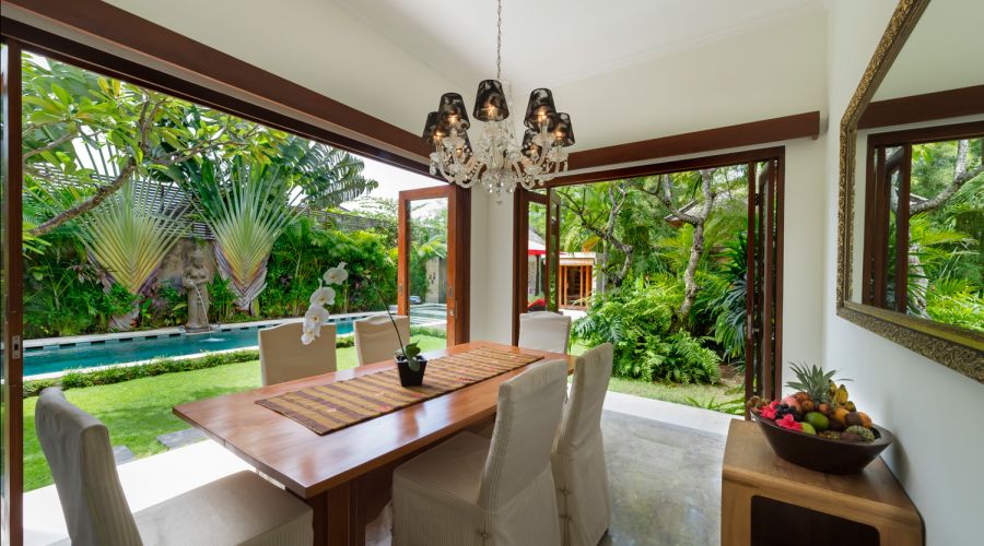 As with the living areas, the dining room, which directly overlooks the garden and pool, can be opened to give a sense of indoor/outdoor living or closed for comfortable, temperature-controlled dining.