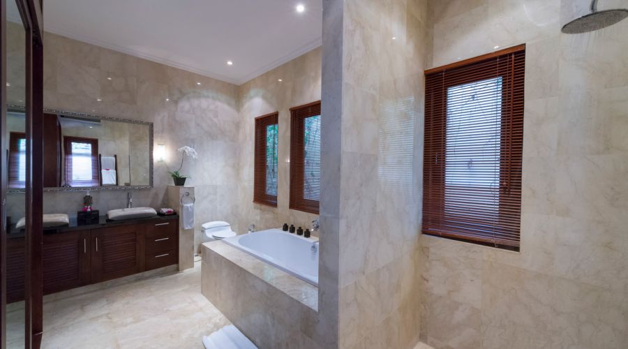 The two beautiful air conditioned bedrooms featuring luxurious four-poster beds. The downstairs rooms have full-length glass doors that can be opened up to view the tropical garden and pool area, whilst the upstairs rooms open out onto the terrace – giving them a wonderful sense of light, space and freshness. All bedrooms are equipped with a TV and DVD player, and all of the upstairs rooms are fitted with an iPod dock and bar fridge. All of the bedrooms have adjoining marble en-suites which feature large bathtubs and rain showers.