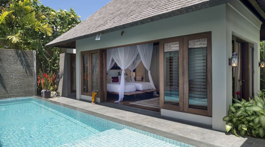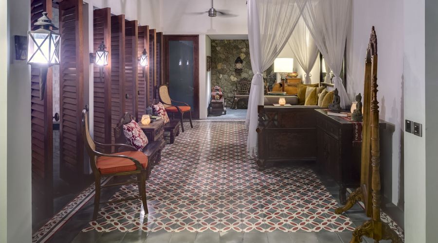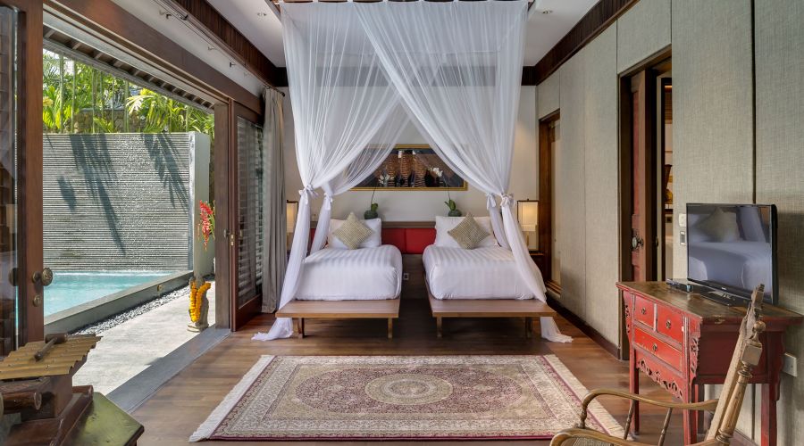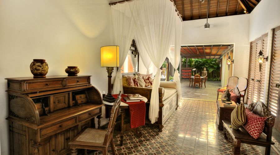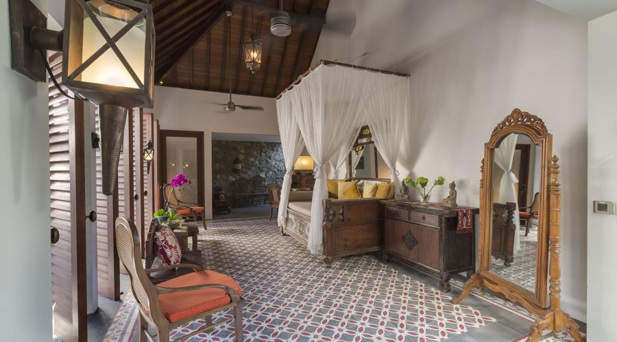 Under a vaulted teakwood-lined roof rises a magnificent four-poster bed swathed in mosquito netting. Colonial-style furniture, antique porcelain and oriental rugs enrich this air-conditioned master suite – even the ultra-modern 47-inch curved TV has a magnificent backdrop, set before an ornately carved mirror-backed geometric panel. The bathroom is just as beautifully decorated, with a dressing area, bathtub framed within a garden alcove, twin basins, and walk-in shower enclosure with pool view.