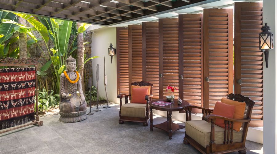 A deeply cushioned daybed is the focus of the fan-cooled living area, an open-sided space defined by a striking floor of traditional patterned tiles, and decorated with antique Indonesian furniture and artefacts. Opposite is another living corner, where a pair of antique armchairs is set before a peaceful Buddha.