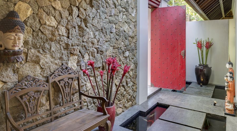The villa is bright red iron-studded door, steps across a small pond lead into an open-sided living area then onto a covered poolside dining pergola and second seating area. Behind the living area is the master bedroom pavilion opening onto the length of the pool terrace, facing the guest bedroom pavilion on the other side