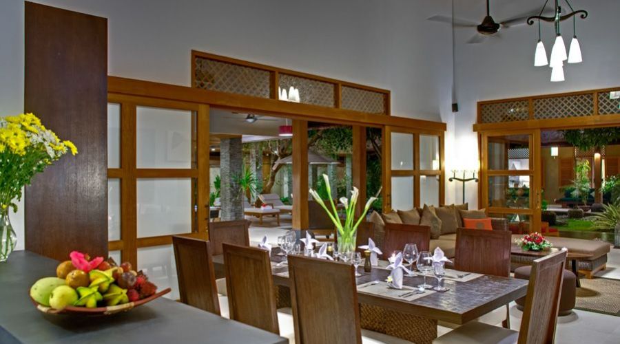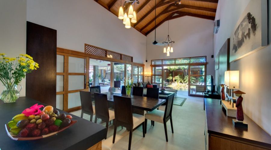 On one side of the pool, there are both indoor, air-conditioned and outdoor living areas. Both offer incredible comfort with huge, deep sofas, attractive arm-chairs with foot rests and, for those looking to sunbathe, sunbeds along one edge of the pool. The covered outdoor living space, cooled by ceiling fans, also includes a bar area, with a large, glass fronted drinks fridge and a 7 feet long, slate bed pool table. Inside there is a 50 inch flat screen TV with cable television offering international programming, a DVD player with surround sound, a large dining table for up to 10 people and a fully equipped European style kitchen.