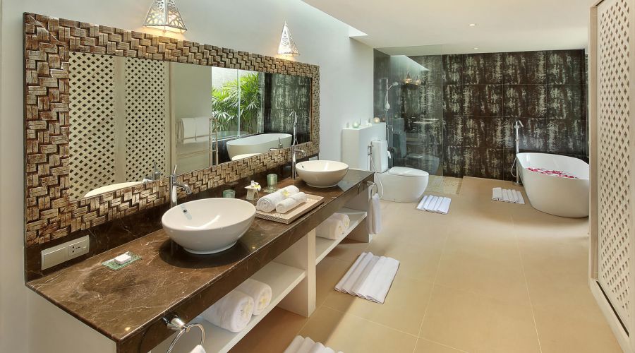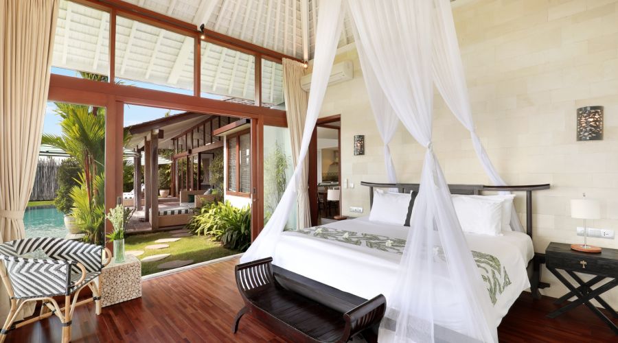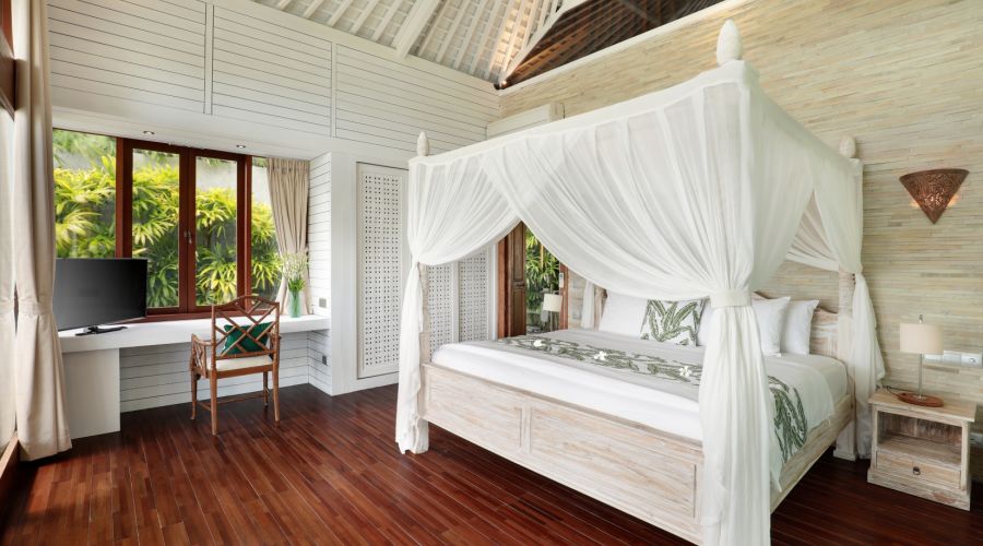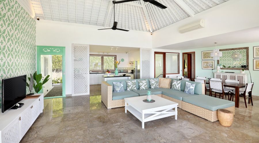 Our 3-bedroom villa is truly our grandest villa, not just in size but also in regard of its features. 3 comfy bedrooms, two having unobstructed ocean views, each room comes equipped with a flat screen LED Smart TV, including en-suite bathrooms with lavish bathtubs, a grand and spacious living room with a fully equipped kitchen, a huge garden and even quarters for your own staff.
