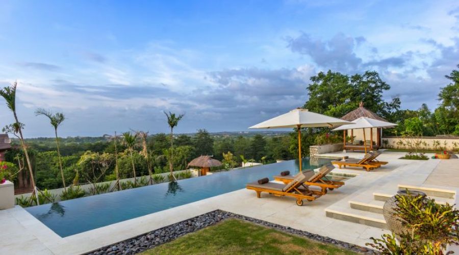 - Infinityedged swimming pool with sun loungers and a Balinese gazebo