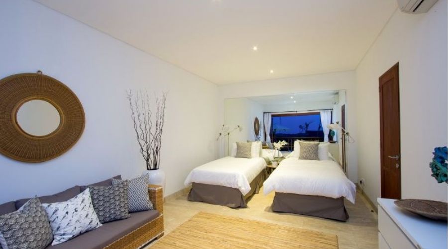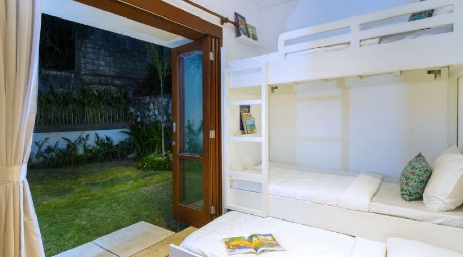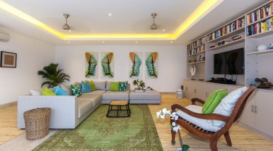 6 bedrooms:A place for you and your friends and family to settle in, relax and play for days. Set in a 2,400 square metre estate, there is ample room for time alone, as well as spaces to come together for meals and fun. Comprising 6 bedrooms with indoor, outdoor tropical bathrooms, with an additional bunk bed room for three children, a cool eight metre plunge pool, an eighteen metre lap pool, two open air living and dining pavillions, a kitchen where the cook will prepare all your meals for you, a bar area just perfect for watching the breathtaking sunsets, an indoor and airconditioned media room and library and a large garden just perfect to let the children loose in – what more could you possibly need?