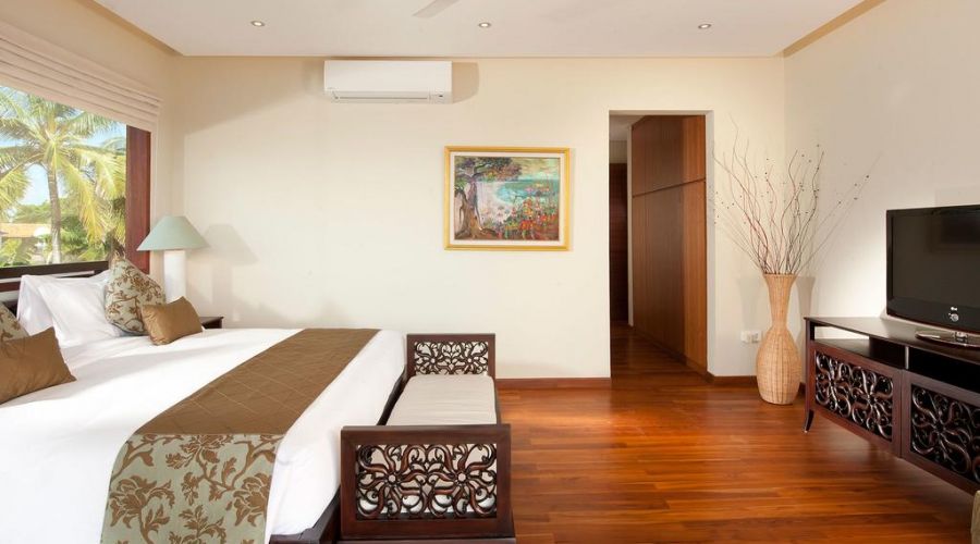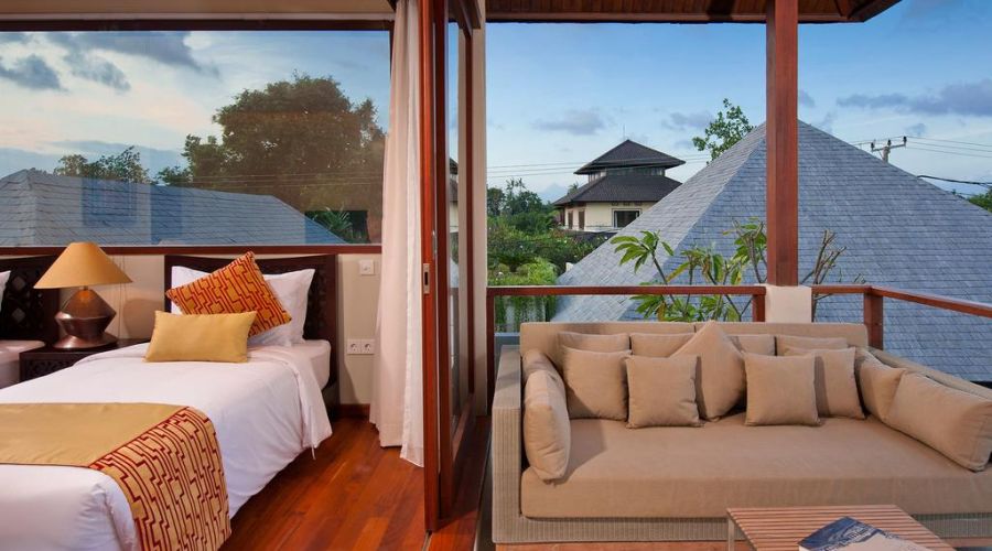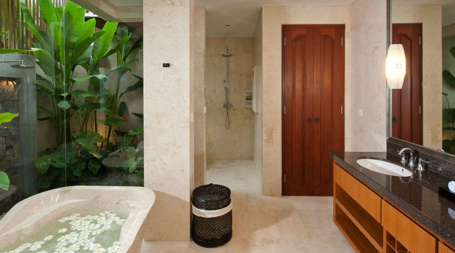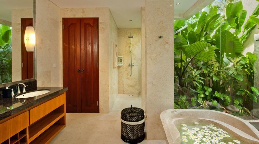 The bedrooms and living spaces of the 3 bedroom of this villa showcase beautiful fine art paintings and limited-edition litho prints by some of Indonesia's best-known artists. Each bathroom features a stone relief carving detailing different aspects of the main temple carving inside the main gate.