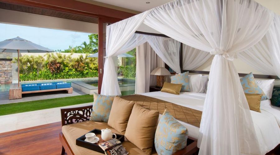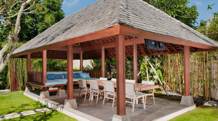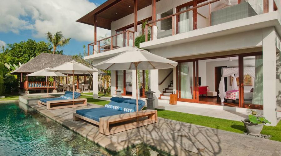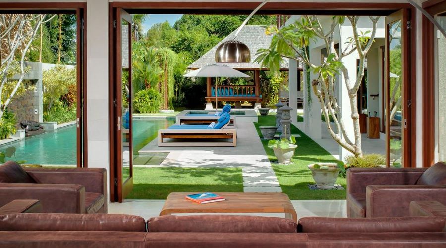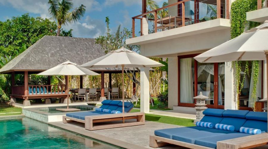 Completed in August 2010, the contemporary Balinese architecture of this villa features a living room and dining room pavilion, a threebedroom pavilion, an entertainment room and business centre, and an open air 'bale' lounge pavilion in the spacious gardens with a 16-metre swimming pool and outdoor Jacuzzi.