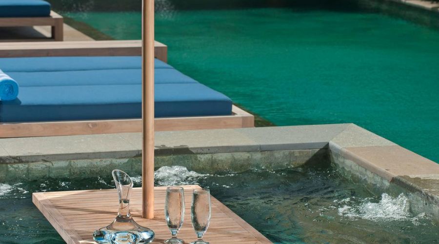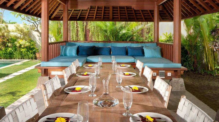 The walled garden and graceful interiors offer an abundance of space, natural light and separate places to relax. Children can enjoy a BOSE surround sound movie on the 48″ flat screen TV in the entertainment pavilion while one group of adults enjoy some reading in the living room, and another group of adults lounge, surf the internet or watch sports on the 45″ flat screen TV in the garden 'bale'. The pool deck is punctuated with big pots of flowering lotus. The interiors of the villa have been lovingly furnished, accented with colour and completed with delightful attention to detail.