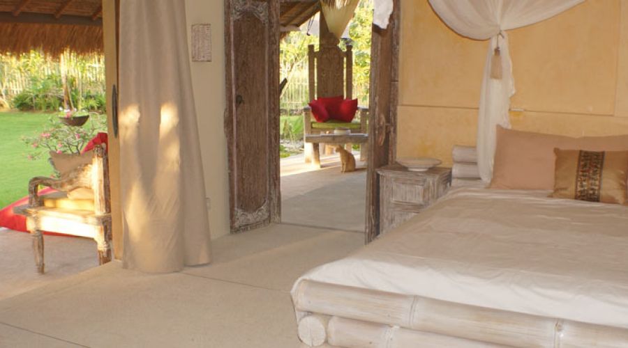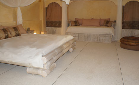 The terracotta floor adds richness to the room, complimented by the king-sized canopy bed.