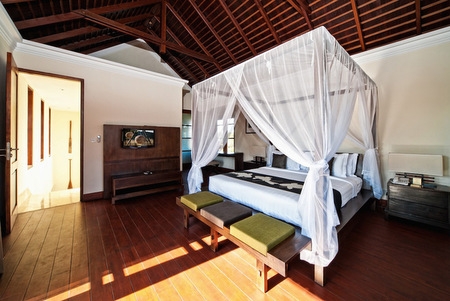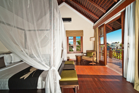 The spacious master bedroom is located upstairs, is en-suite, with a walk-in wardrobe, satellite TV and its own wooden spacious balcony.