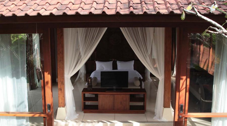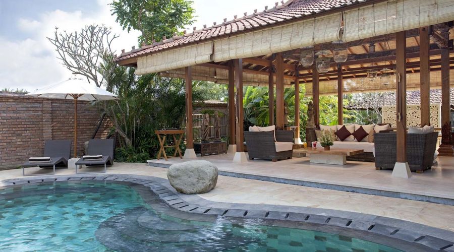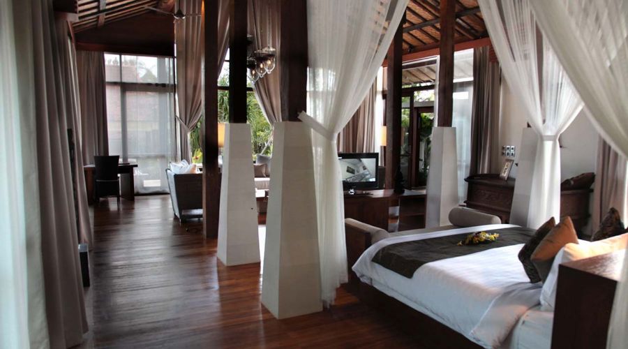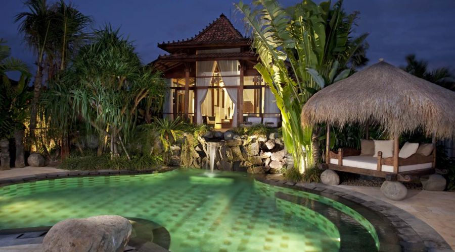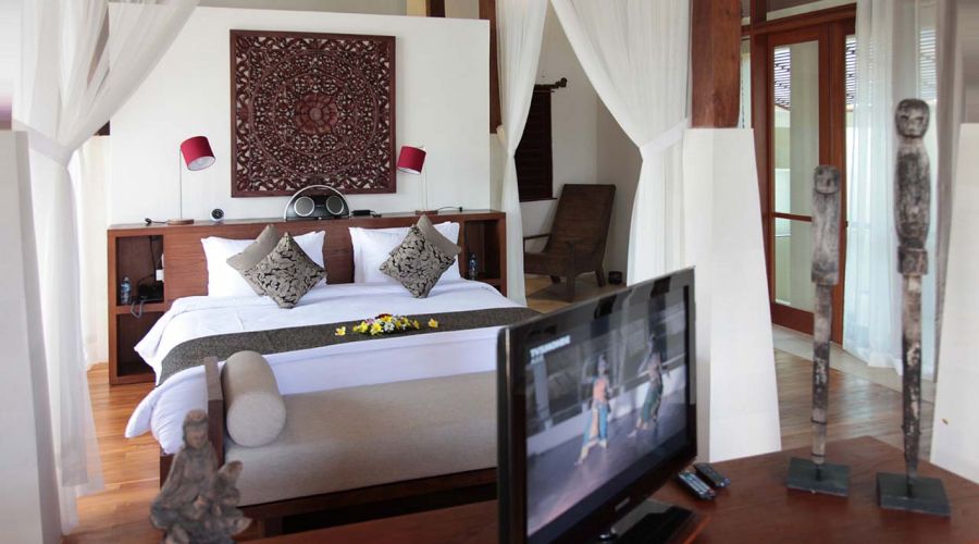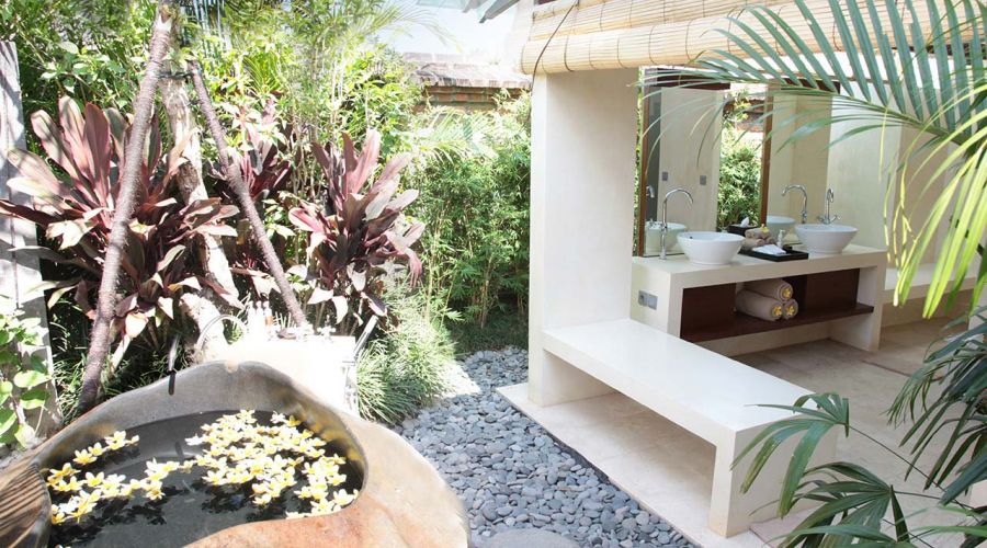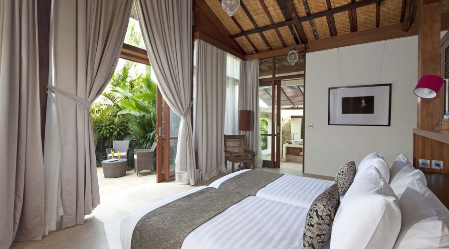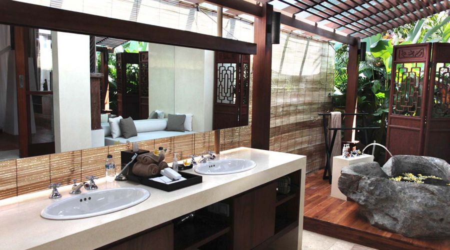 Villa’s three bedrooms offer a level of privacy that is rare in similar-sized villas in Bali. With soaring ceilings, floors of terrazzo or teakwood edged in acid-washed marble, they are infused with light from towering windows and extra-wide sliding doors that open onto private garden terraces and tropical bathrooms with double basins, rain showers and double bathtubs carved from river rock. All have air-conditioning and overhead fans, iPod docks, flat-screen TVs with satellite channels and DVD players. And throughout each room are scattered glorious oriental and Indonesian antiques, curios, carvings and ceramics.