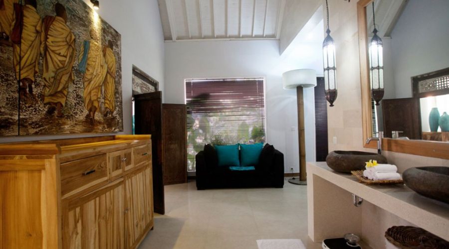 A guest toilet is located just off the living area to preserve privacy in the bedrooms. The tropical garden offers a large private pool (10m x 3m) and a nice ‘Bale’ with wood deck. Here it’s the perfect place to enjoy drinks and