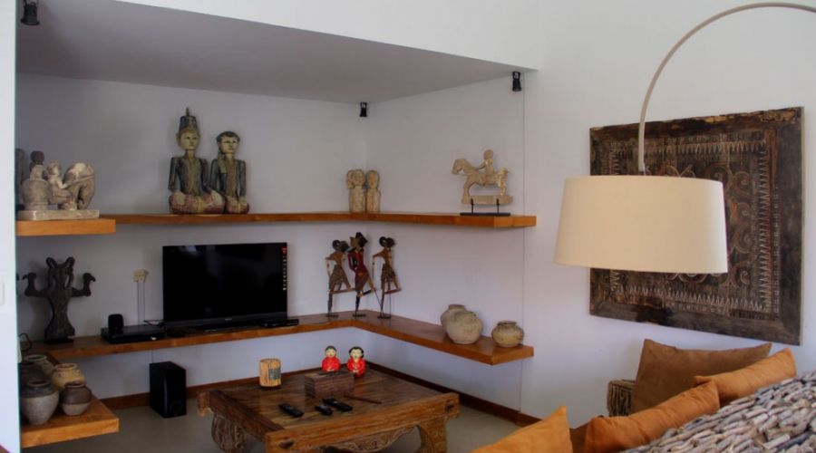 Traditional Indonesian artifacts are displayed on wall shelves. The living area has 2 big sofas with cushioned pillows. Here you can