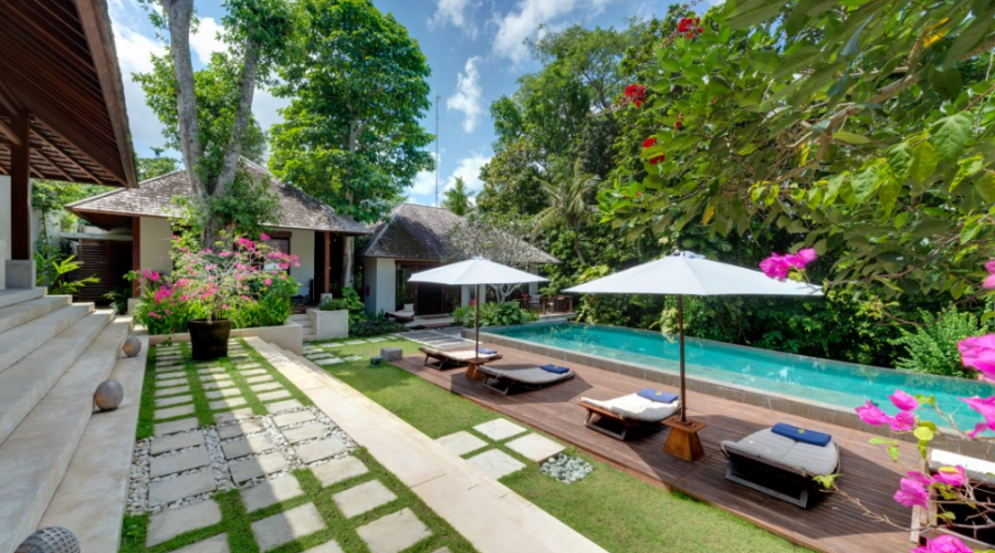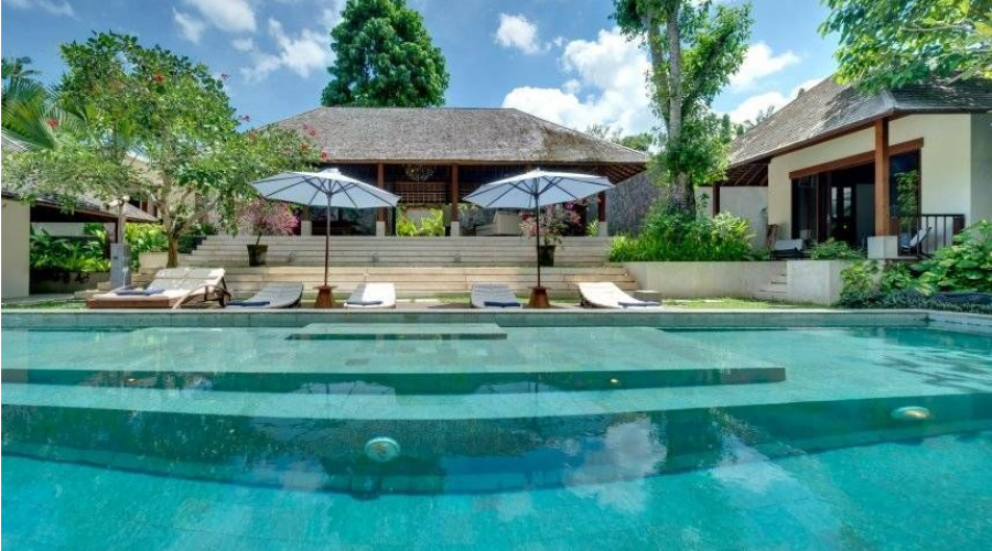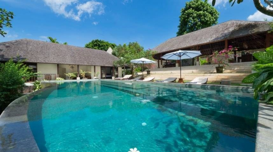 The architect designed the villacomprising of 5 separate bedroom pavilions with feature ceilings including 4 double bedrooms, a multi-media room, a separate modern kitchen, and a magnificent open air main pavilion. The infinity pool is fronted by hardwood decking with sunbeds. It is designed with multiple depths so children of all ages can enjoy it. The lower plunge pool fronts the river where you sometimes see fish or swimming lizards.