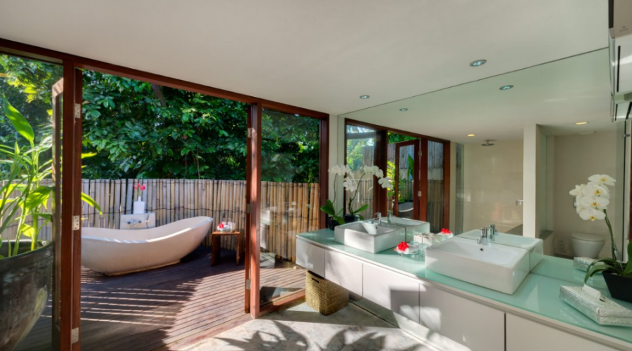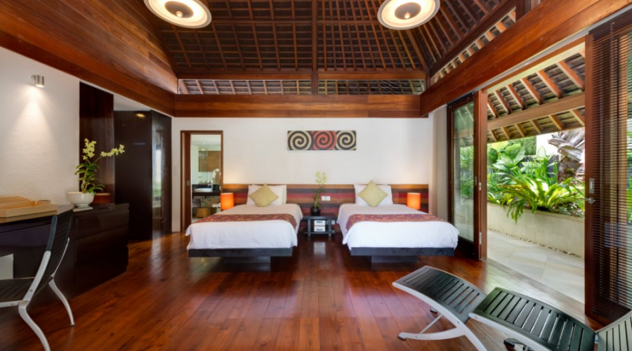 Two of the bedrooms have double beds; the other two are twins but they can be joined to form double beds. If you have an extra (small) person then the staff can set out a cot or additional single bed. Each bedroom is complete with an en-suite bathroom, dressing area and hi-fi (including iPod connection). Air conditioning and ceiling fans are fitted in all bedrooms. The really comfortable beds have medium firmness King Coil mattresses imported from the USA. The master bedroom has a secluded outside tub for those who like alfresco bathing.