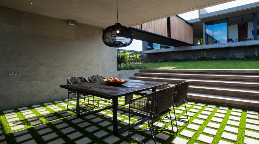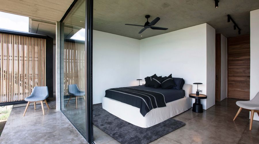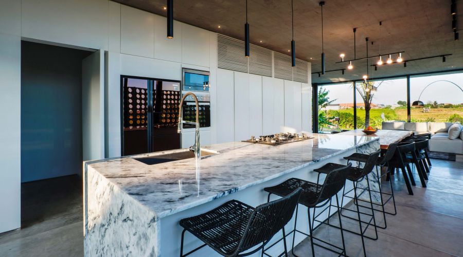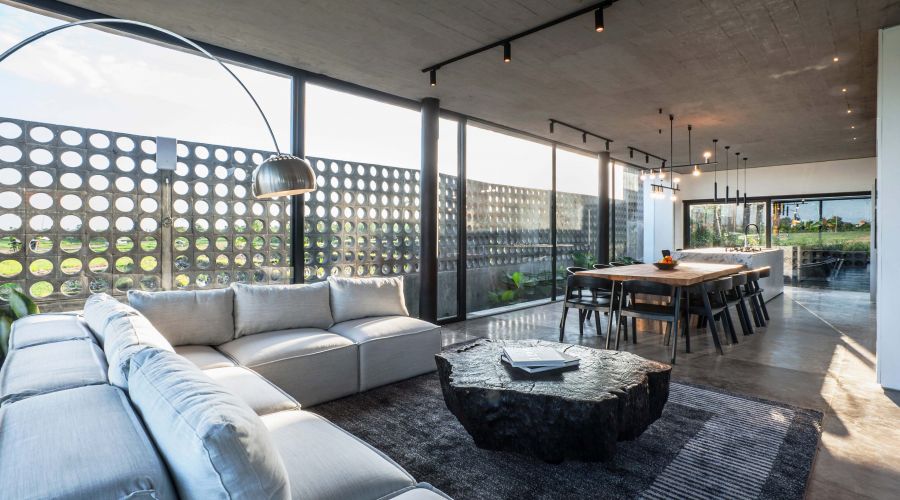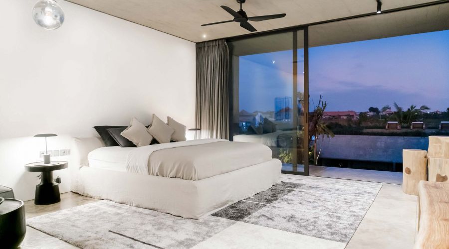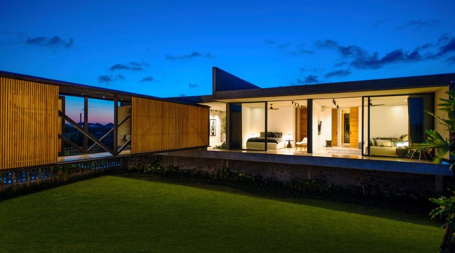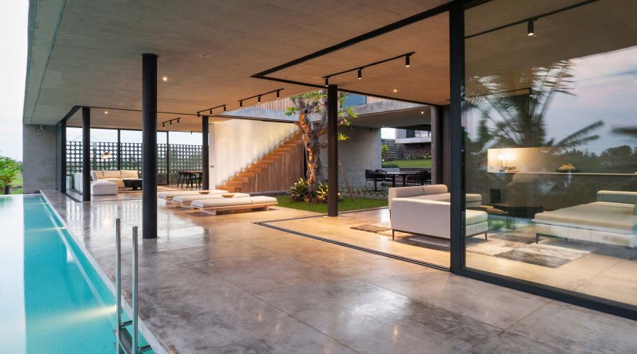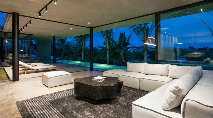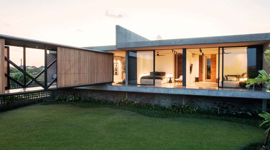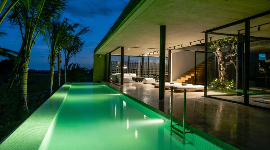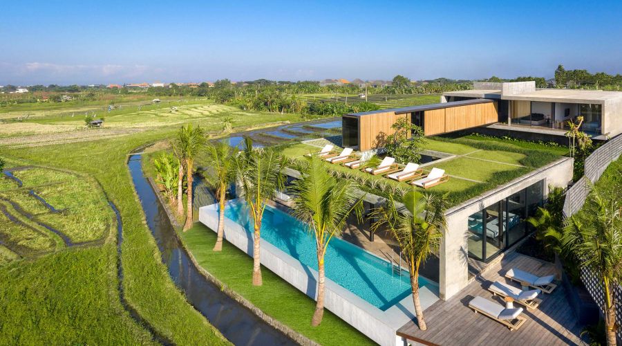 An exquisitely designed Balinese modern masterpiece. The project is divided into two main closed living volumes, separated by a steel bridge. The bottom section comprises the entire social area, while the upper section enfolds the more sheltered suites. Floor-to-ceiling imported aluminum glass sliding doors showcase a panoramic view of lush rice fields, capturing the green and natural Bali. One of the most remarkable home sites on the island.