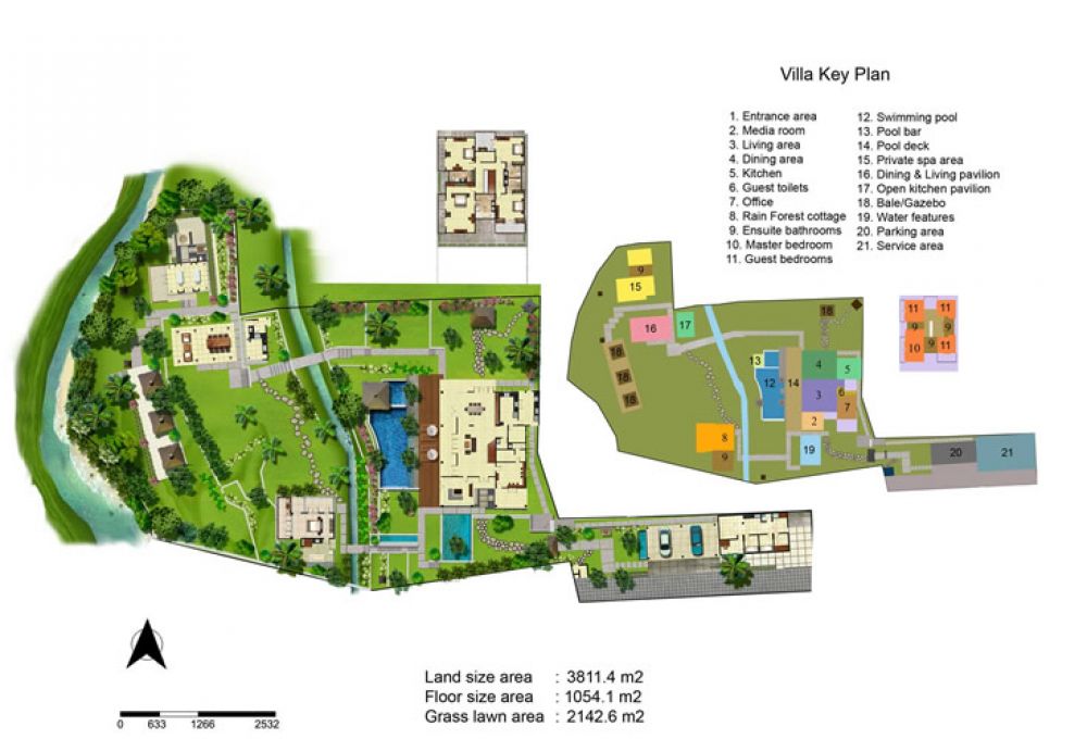 The villa has lush private gardens, a 20-meters lap pool, a children’s wading pool, open-air lounge pavilion, three thatched bales, a private spa, spacious living/dining areas, a fully equipped modern kitchen, a cozy TV room equipped with cable TV/DVD player and a DVD collection, a quiet office equipped with a mini library, iPod with dock, a desktop computer with broadband Internet, fax and printer, and five luxurious bedrooms with ensuite bathrooms.