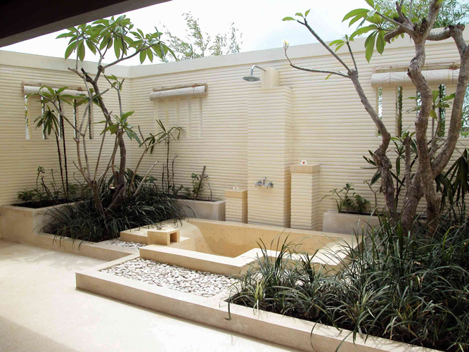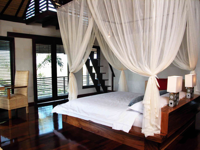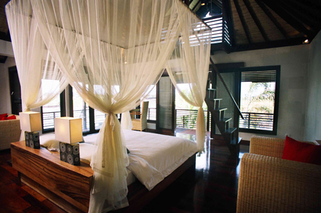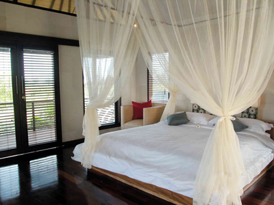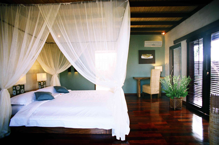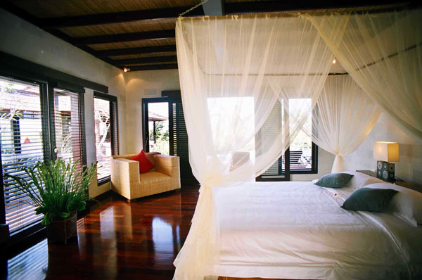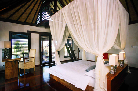Set around a five-by-17-meter infinity pool, each of Coraffan's bedrooms, finished with white palimanan stone and merbau wooden floors, has a unique view.