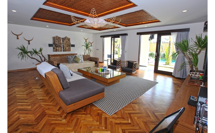 A mixture between Balinese architecture and contemporary living with an open concept lounge and dining pavilion. A family room with air-conditioner and comfortable sofa, large flat screen TV, DVD and sound system also available for you to unwind and or to be relaxed with all friends and family members.