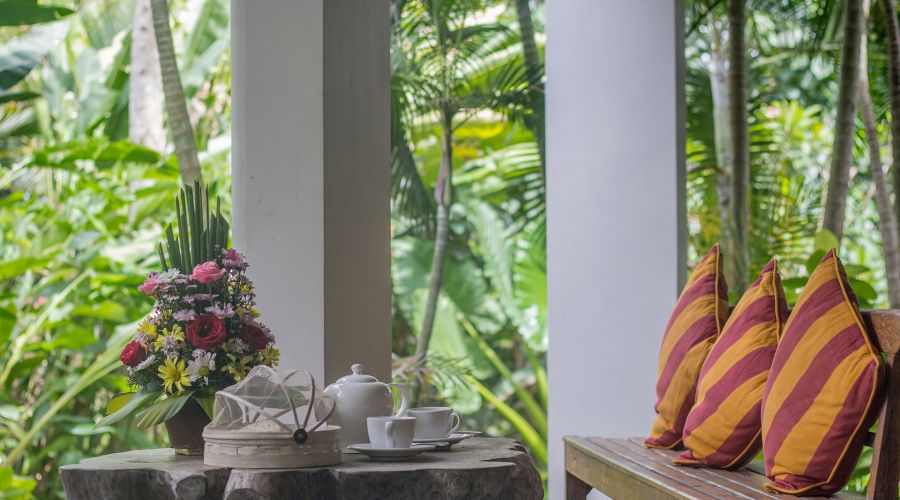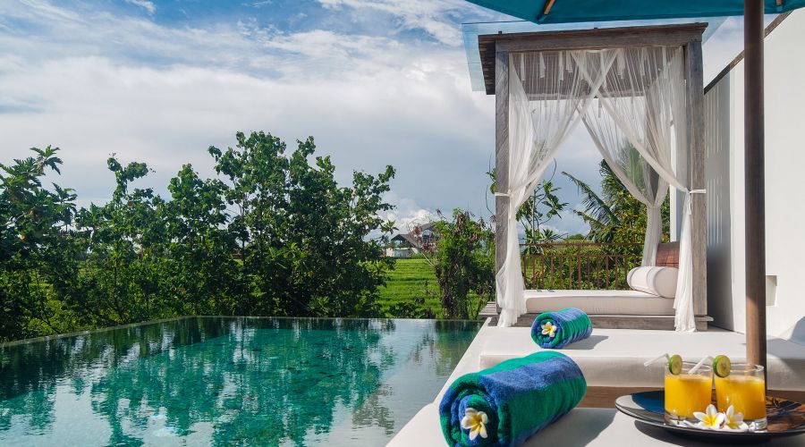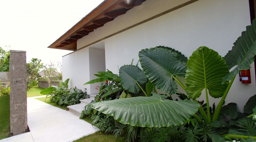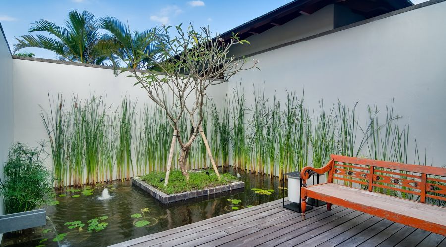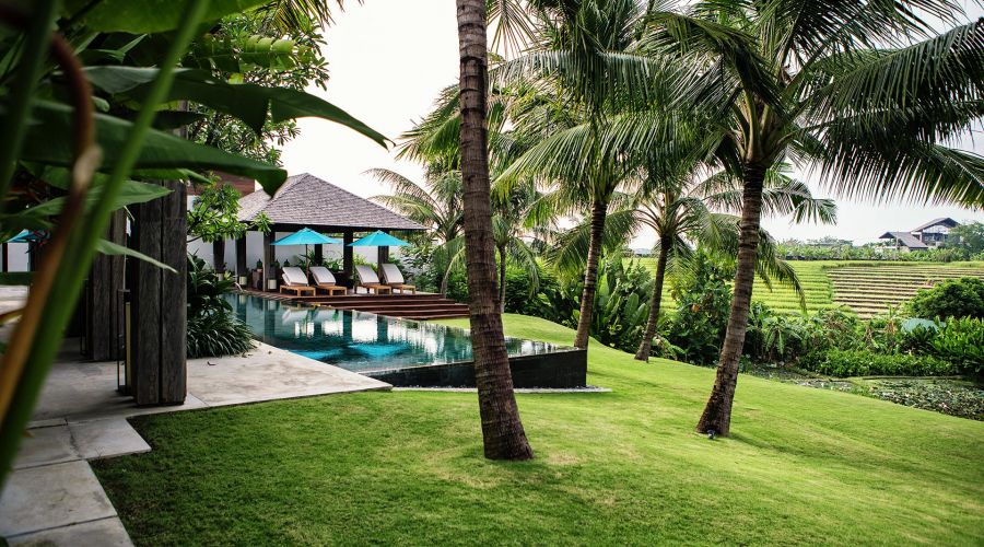 The villa is set on 5,900m² of landscaped land with views of rice paddies and distant volcanoes. Sustainability measures include the capture of rainwater for the watering of the lily and lotus ponds. Over 100 varieties of plants and trees were chosen to enhance the design features. Each villa has a unique private timbered deck and various water features.