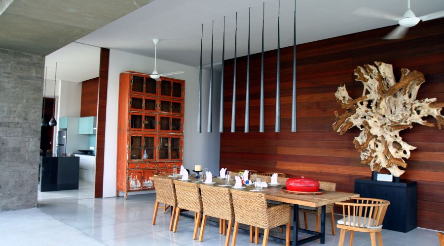 The villa main pavilion has a large, open dining area, which leads onto the swimming pool terrace and a 25-meter infinity pool. A stylish kitchen is available for more casual breakfasts with amazing views towards paddy and mountains.